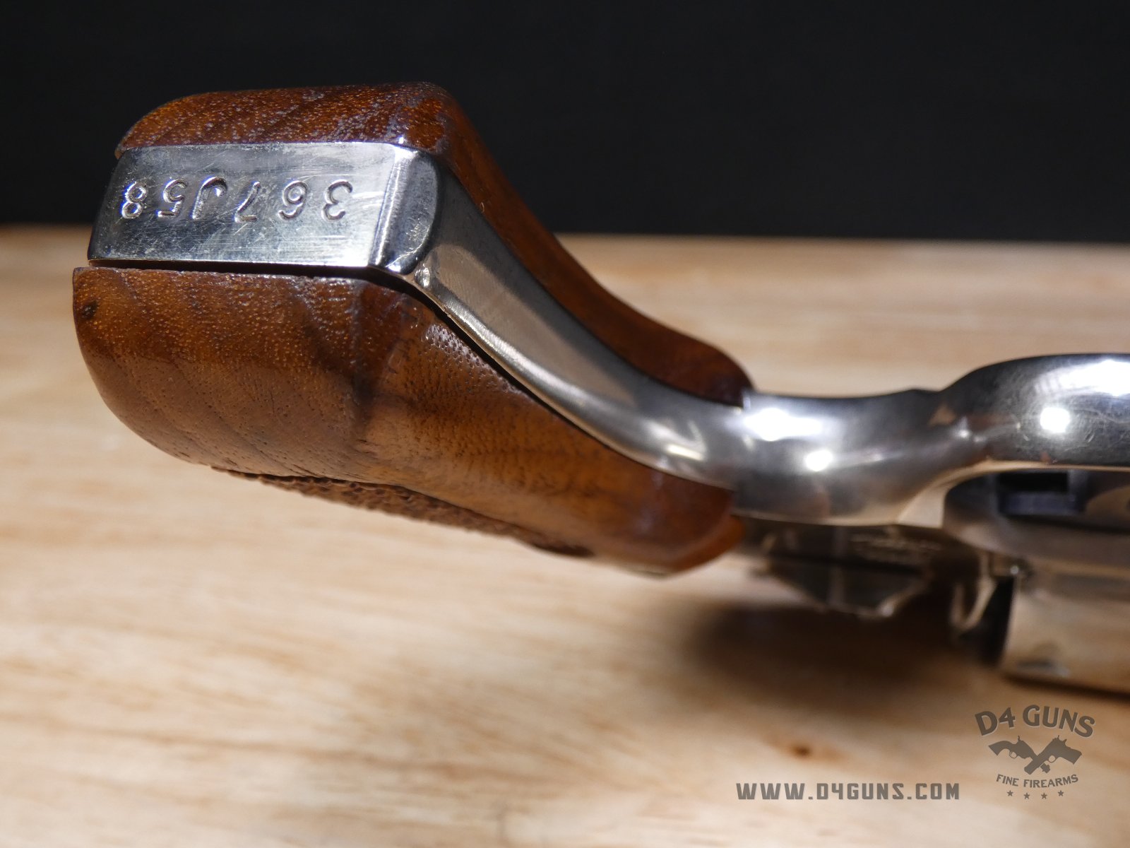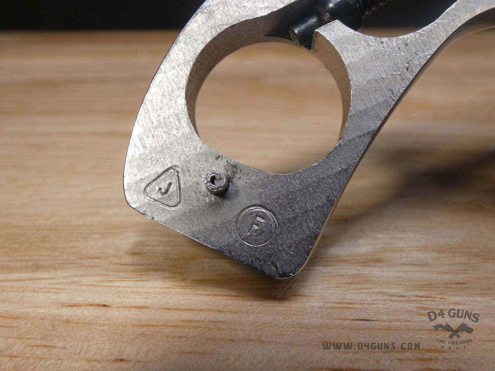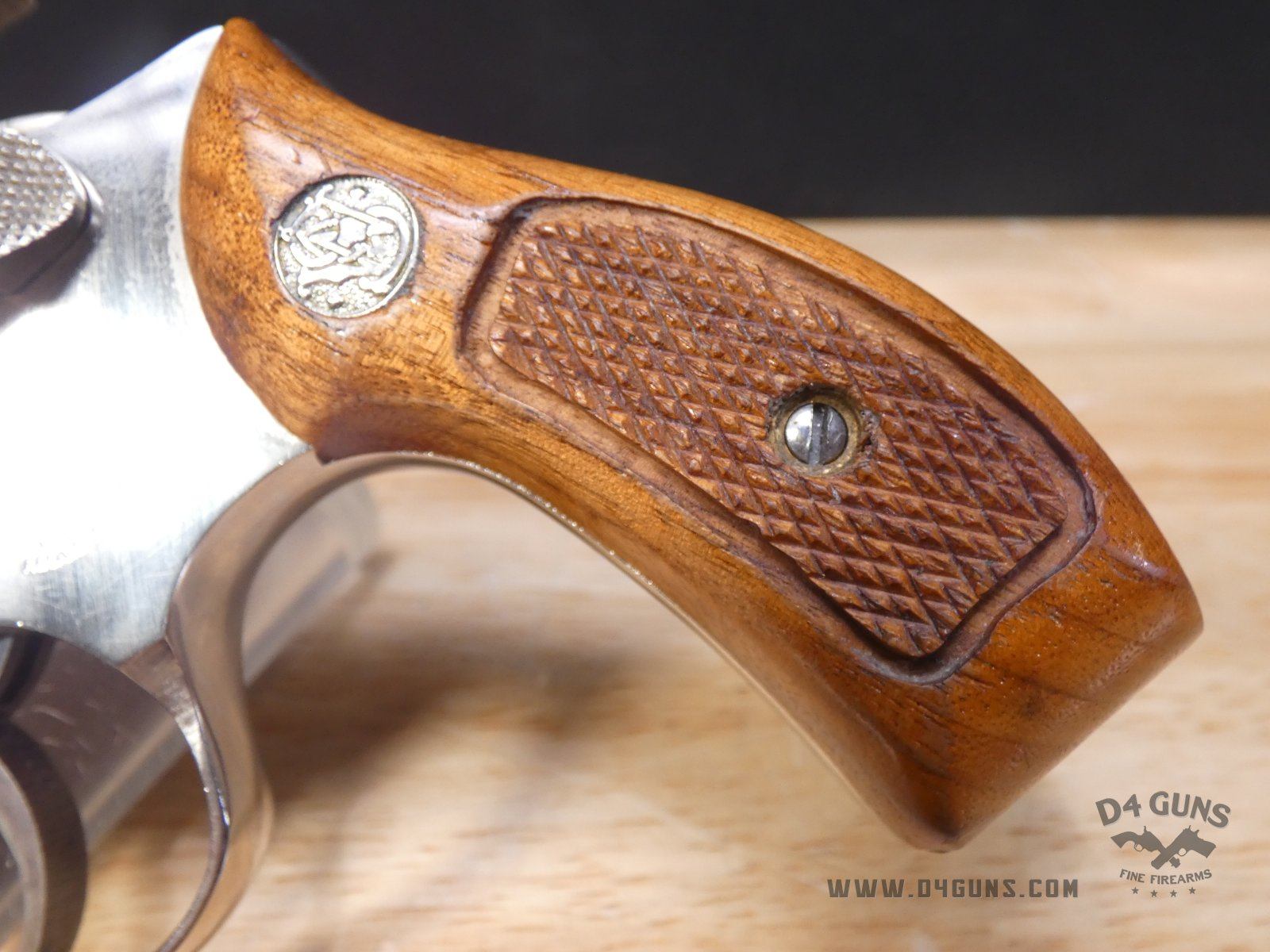 For sale is a Smith & Wesson Model 36 revolver in .38 S&W SPL. Serial number- 367J58. This 5 shot Model 36 is in good condition and features a nickel plated finish with wood grips. The Model 36 was designed in the era just after World War II, when Smith & Wesson stopped producing war materials and resumed normal production. For the Model 36, they sought to design a revolver that could fire the more powerful .38 Special round in a small, concealable package. The new design was introduced at the International Association of Chiefs of Police (IACP) convention in 1950, and was favorably received. A vote was held to name the new revolver, and the name "Chiefs Special" won. It was produced as the "Chiefs Special" until 1957, when it then became the Model 36. This revolver has proved to be reliable and popular for personal protection due to its size and weight. V2-E1 Barrel Length: 2 Bore condition: Excellent