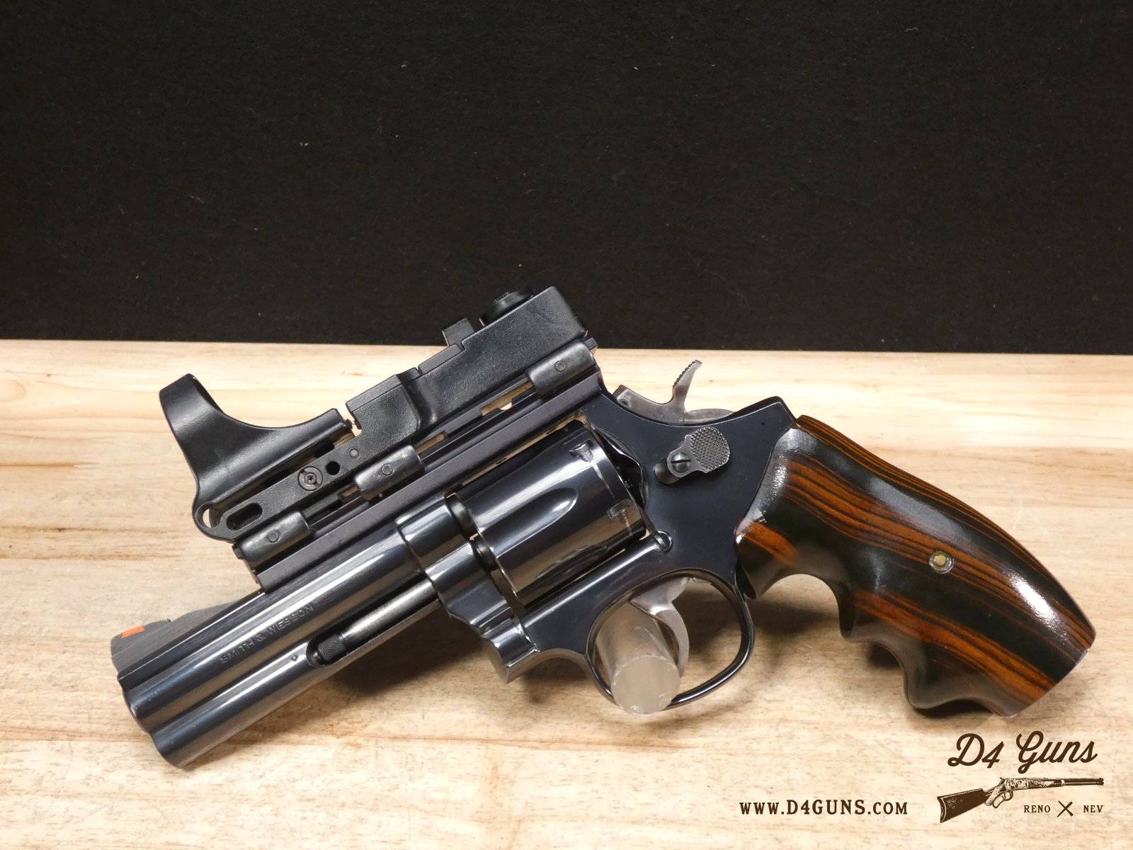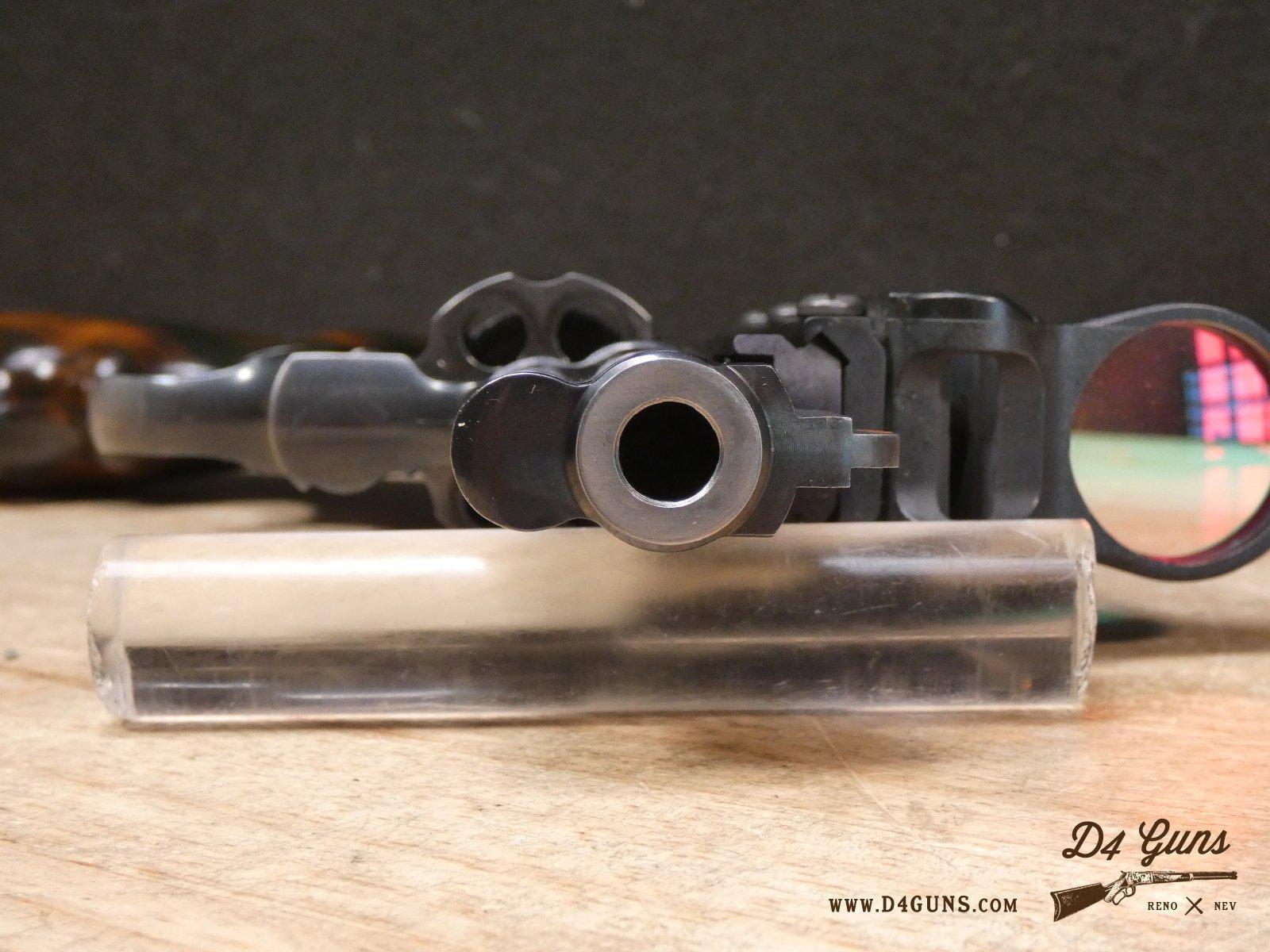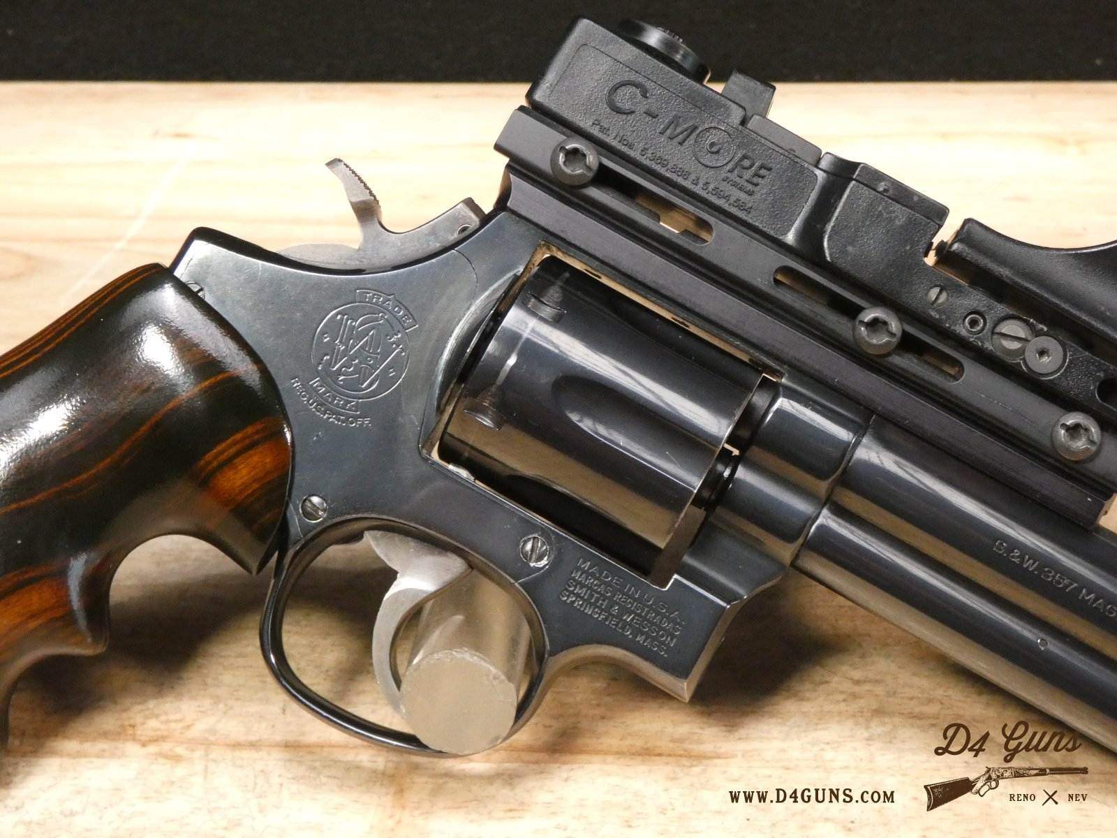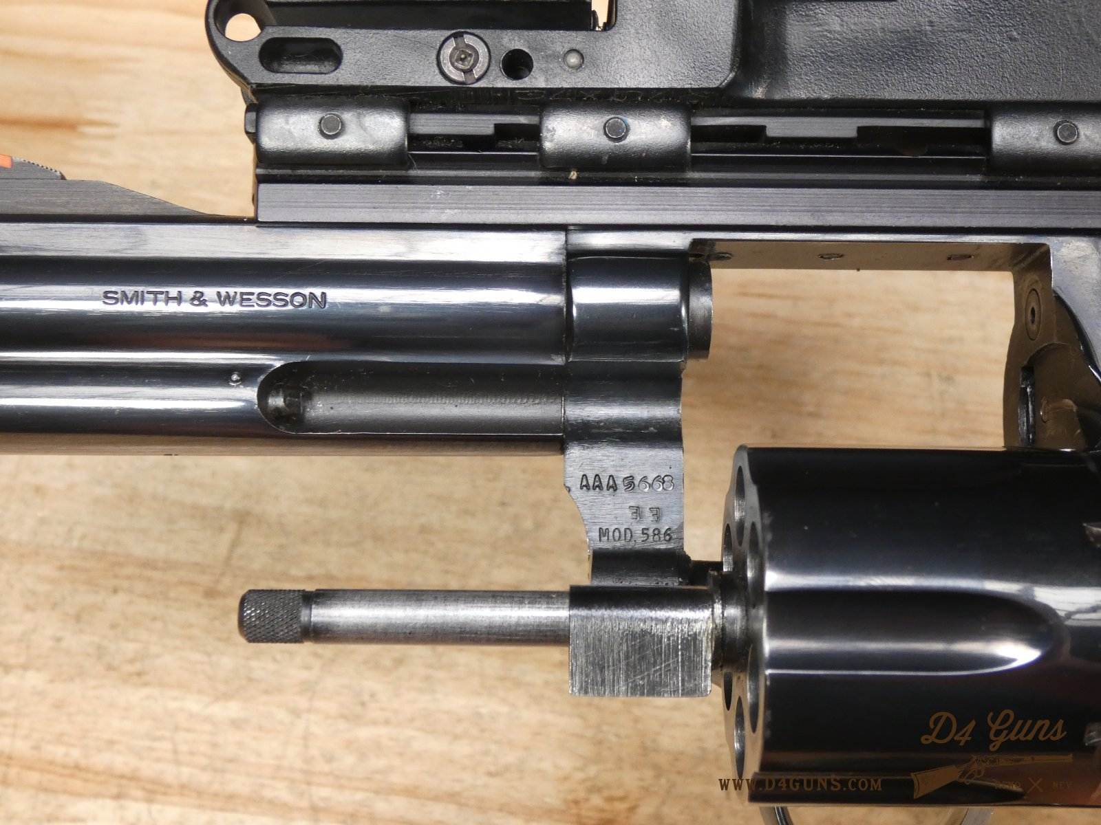 For sale is a Smith & Wesson Model 586 revolver in .357 Mag. Serial number- AAA5668. The Smith & Wesson Model 586 is an L-Frame, double-action revolver chambered in .357 magnum. The L-Frame Smith & Wesson is a "medium/heavy" frame specifically designed to hold up to prolonged use with full-power .357 magnum loads, as well as any .38 Special ammunition. The 586 features a 6-round cylinder; and a full-length lug under the barrel puts extra weight out front to reduce muzzle flip. The revolver is constructed of carbon steel and has a traditional, deep Smith & Wesson blue finish. A C-More red dot sight and wood grips are included with this revolver. V2-F2 Barrel Length: 4 Bore condition: Excellent