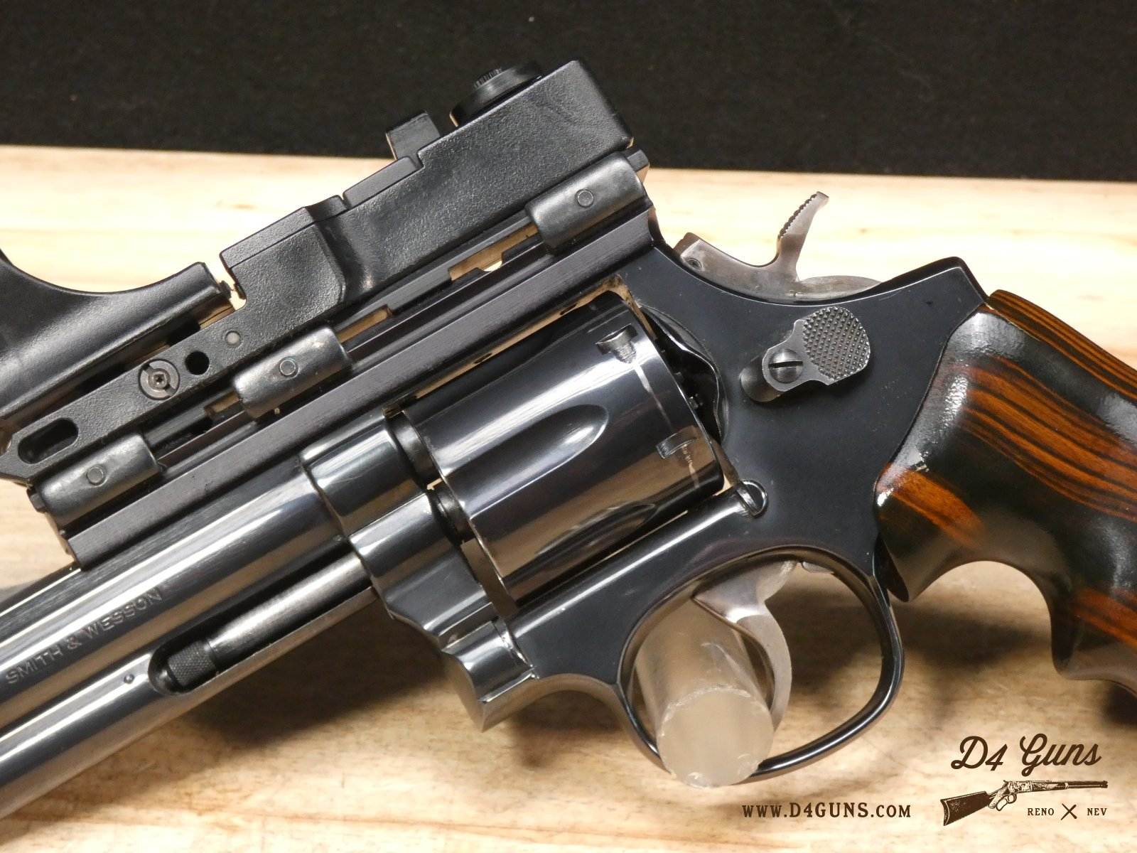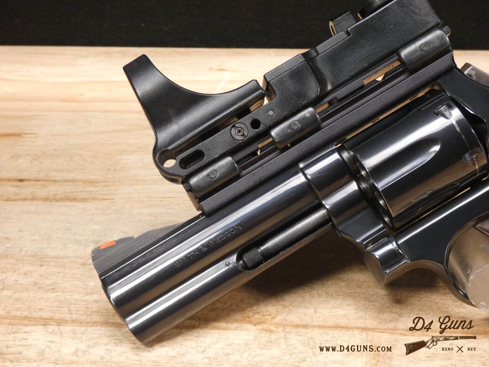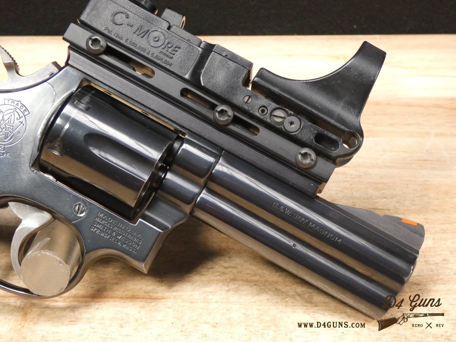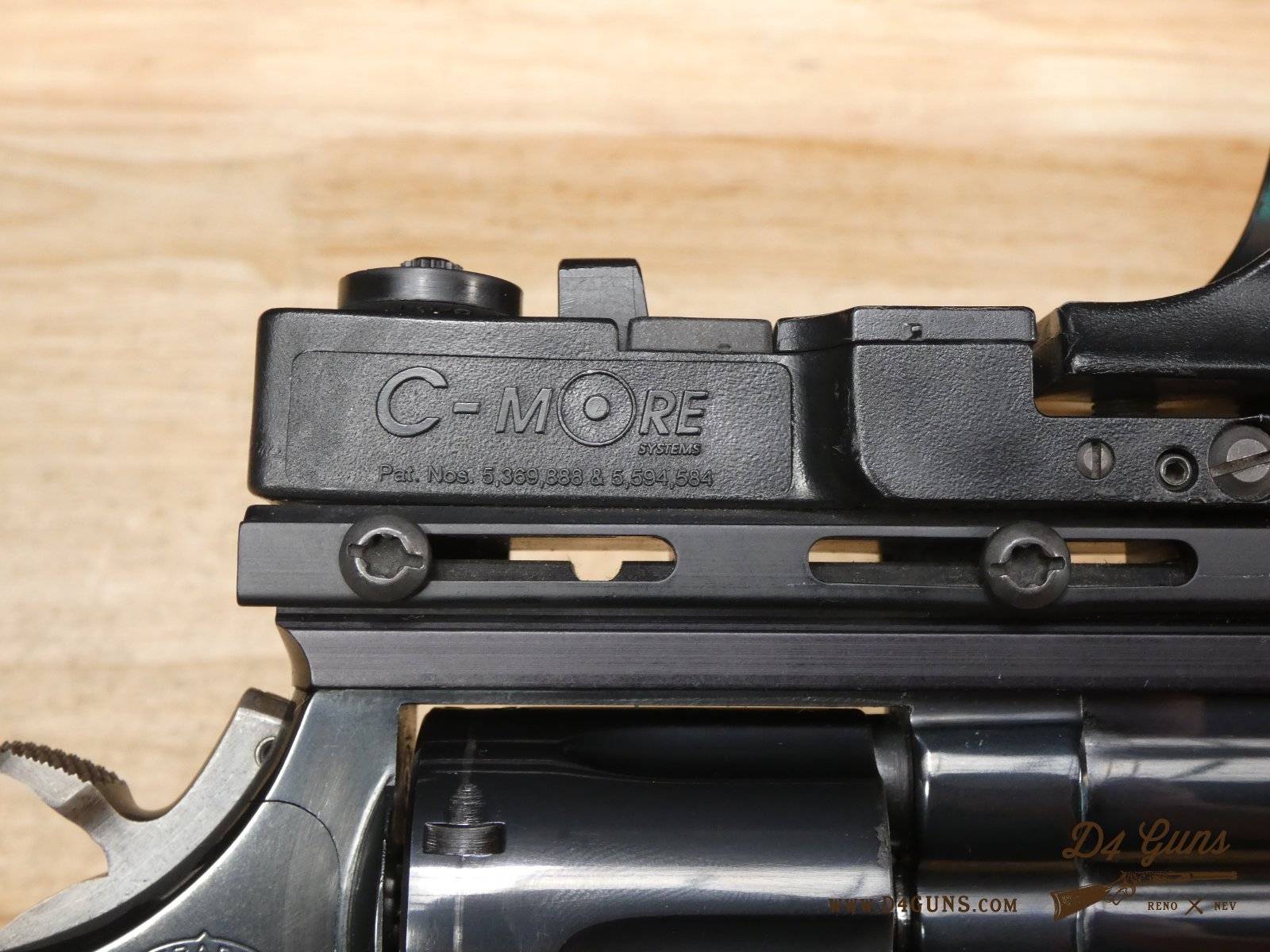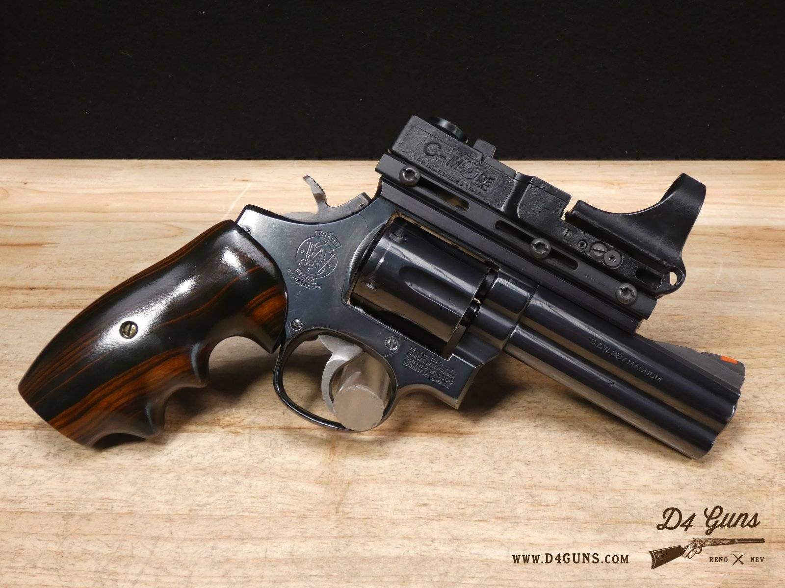 For sale is a Smith & Wesson Model 586 revolver in .357 Mag. Serial number- AAA5668. The Smith & Wesson Model 586 is an L-Frame, double-action revolver chambered in .357 magnum. The L-Frame Smith & Wesson is a "medium/heavy" frame specifically designed to hold up to prolonged use with full-power .357 magnum loads, as well as any .38 Special ammunition. The 586 features a 6-round cylinder; and a full-length lug under the barrel puts extra weight out front to reduce muzzle flip. The revolver is constructed of carbon steel and has a traditional, deep Smith & Wesson blue finish. A C-More red dot sight and wood grips are included with this revolver. V2-F2 Barrel Length: 4 Bore condition: Excellent