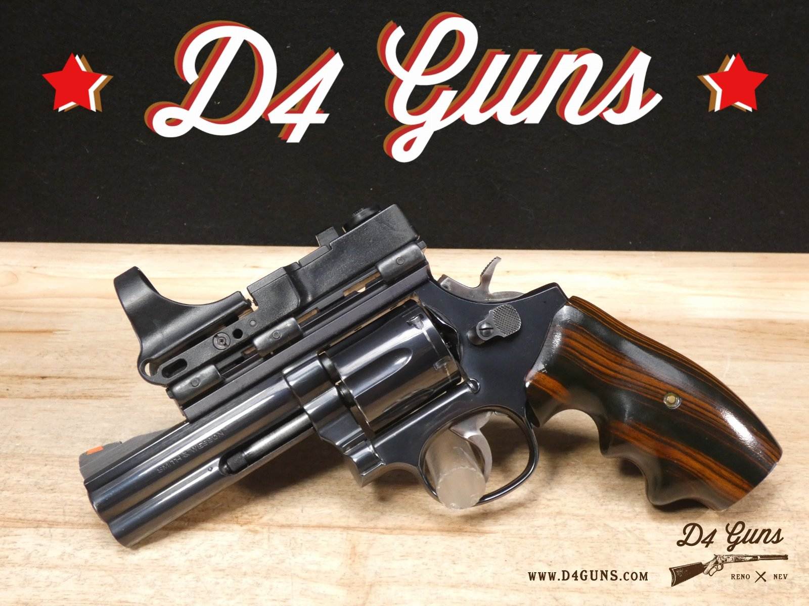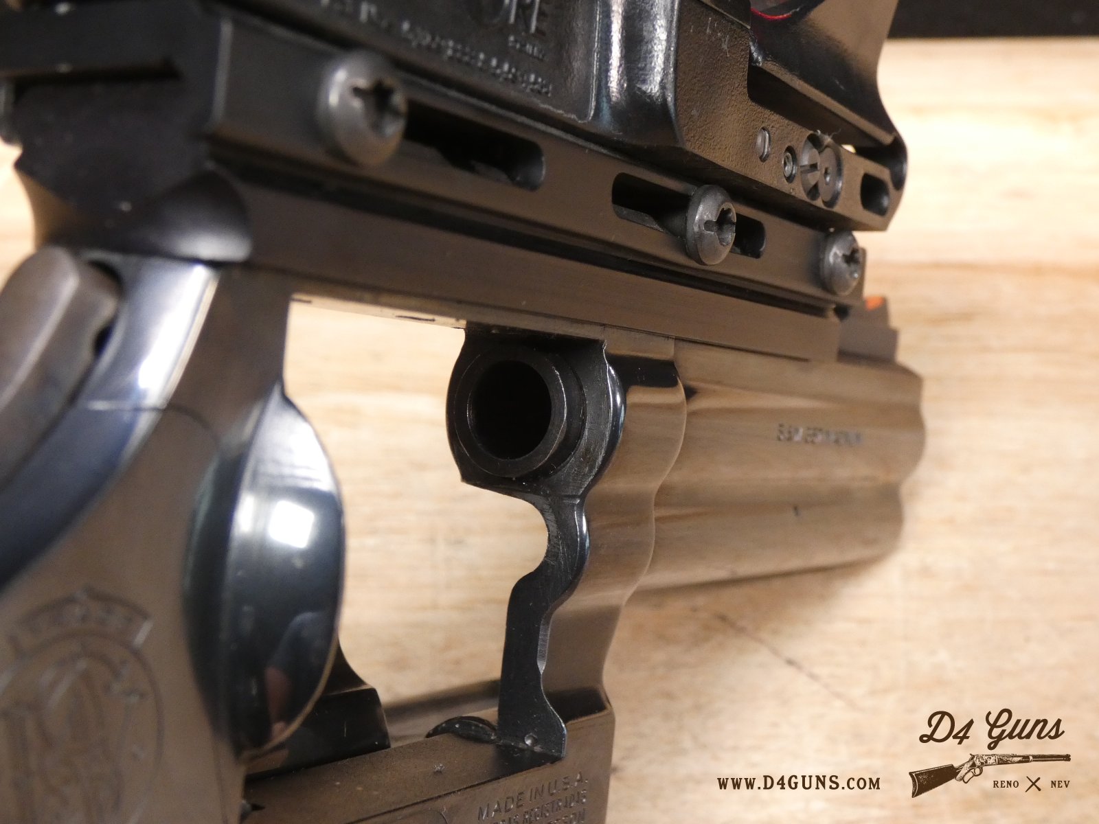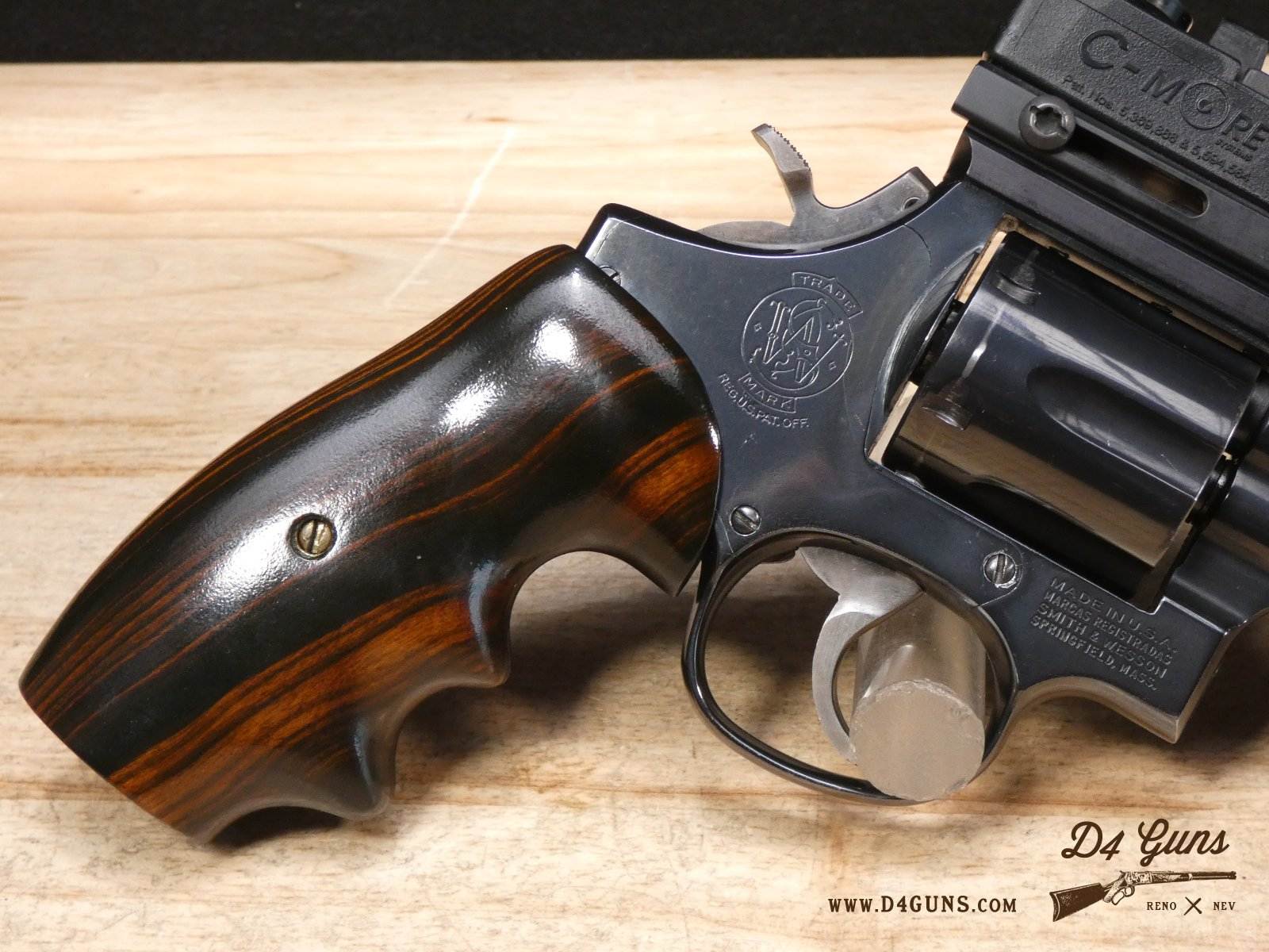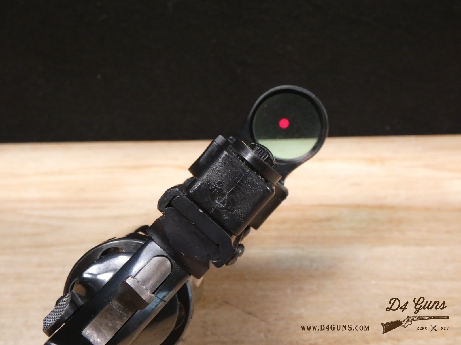 For sale is a Smith & Wesson Model 586 revolver in .357 Mag. Serial number- AAA5668. The Smith & Wesson Model 586 is an L-Frame, double-action revolver chambered in .357 magnum. The L-Frame Smith & Wesson is a "medium/heavy" frame specifically designed to hold up to prolonged use with full-power .357 magnum loads, as well as any .38 Special ammunition. The 586 features a 6-round cylinder; and a full-length lug under the barrel puts extra weight out front to reduce muzzle flip. The revolver is constructed of carbon steel and has a traditional, deep Smith & Wesson blue finish. A C-More red dot sight and wood grips are included with this revolver. V2-F2 Barrel Length: 4 Bore condition: Excellent