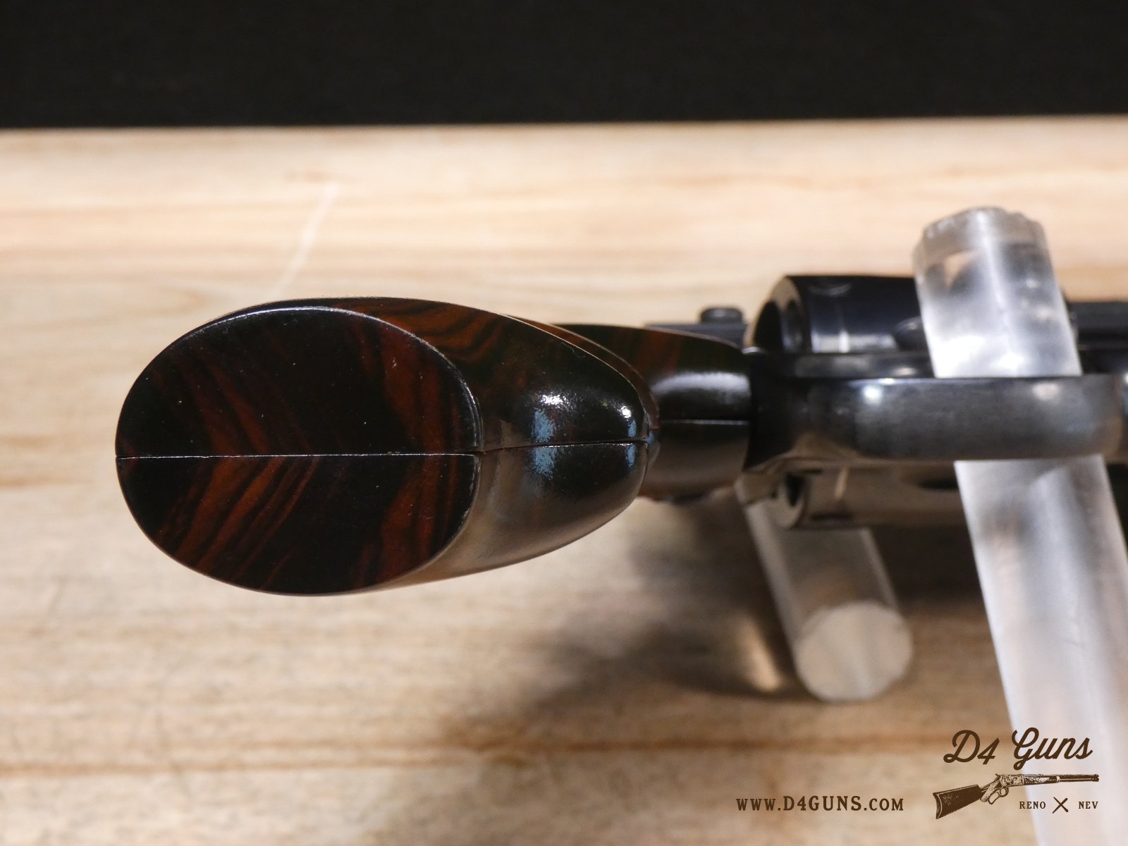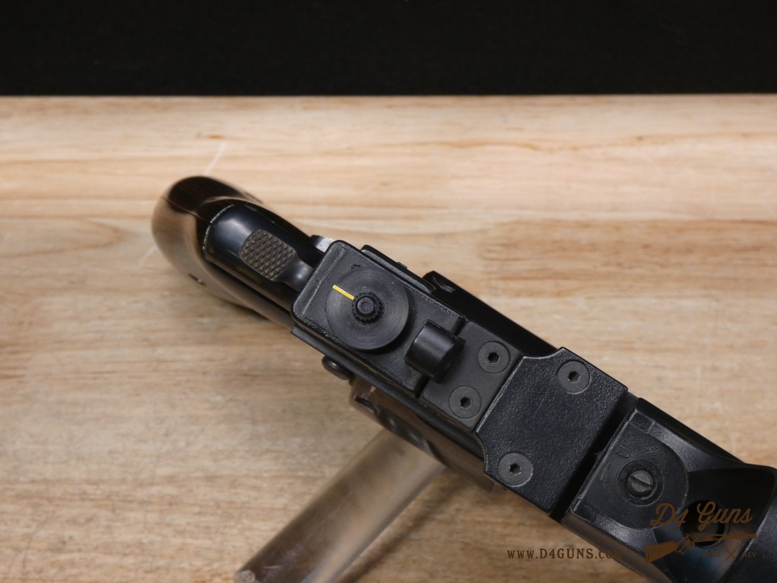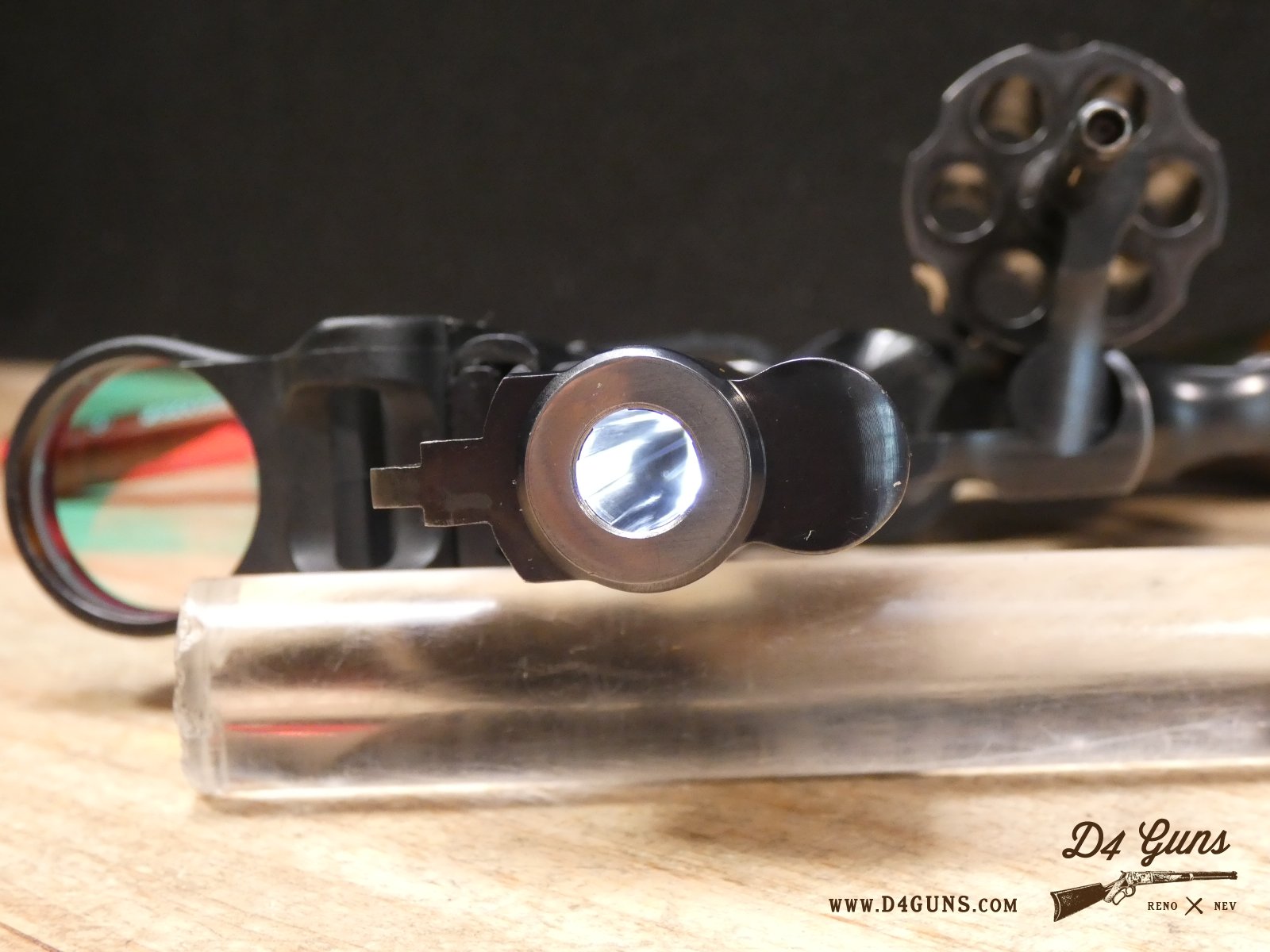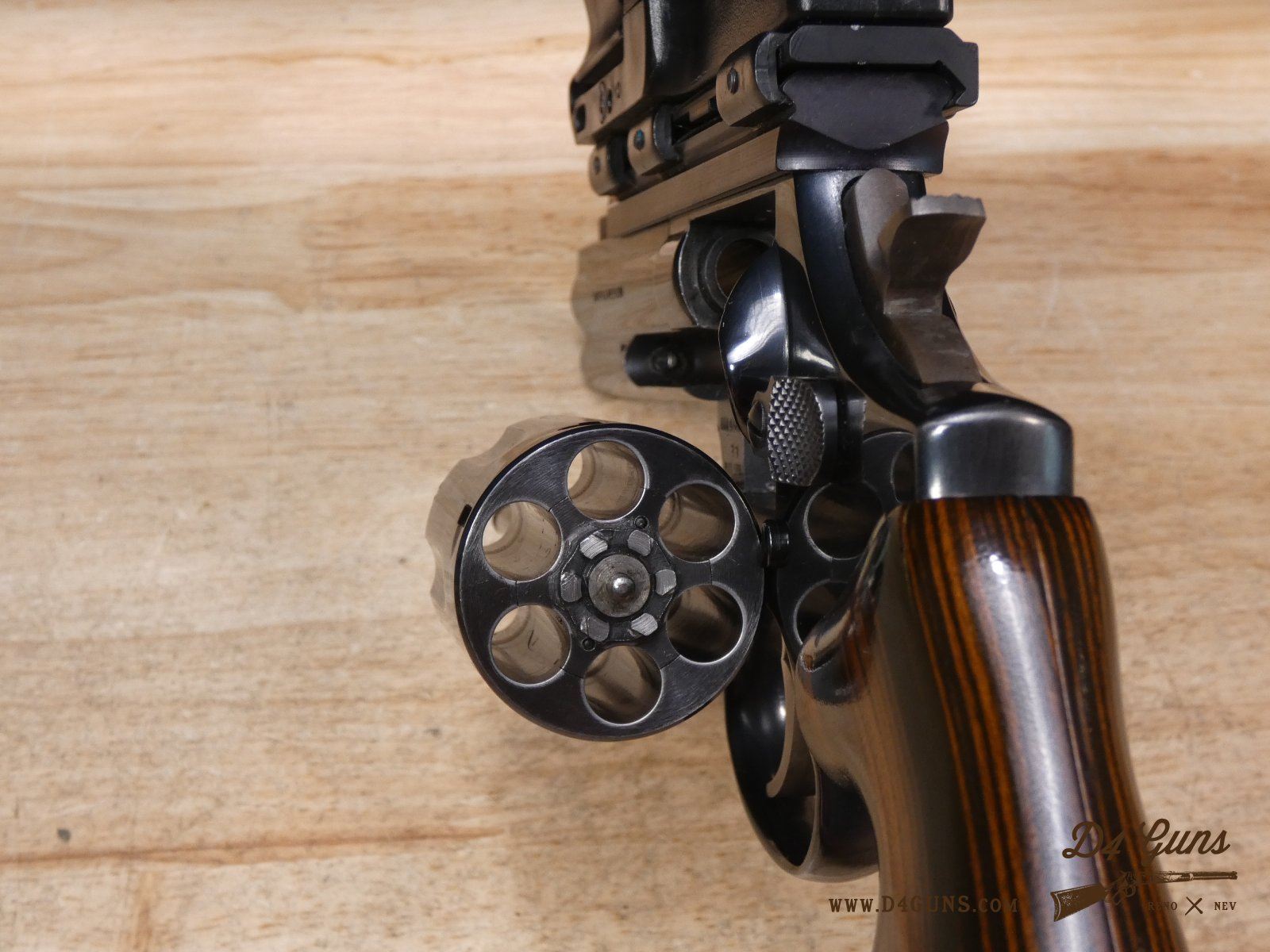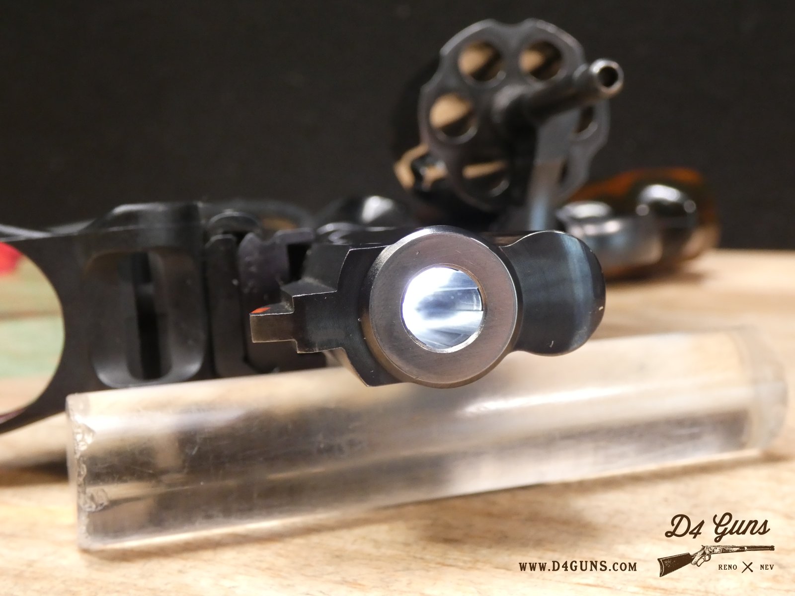 For sale is a Smith & Wesson Model 586 revolver in .357 Mag. Serial number- AAA5668. The Smith & Wesson Model 586 is an L-Frame, double-action revolver chambered in .357 magnum. The L-Frame Smith & Wesson is a "medium/heavy" frame specifically designed to hold up to prolonged use with full-power .357 magnum loads, as well as any .38 Special ammunition. The 586 features a 6-round cylinder; and a full-length lug under the barrel puts extra weight out front to reduce muzzle flip. The revolver is constructed of carbon steel and has a traditional, deep Smith & Wesson blue finish. A C-More red dot sight and wood grips are included with this revolver. V2-F2 Barrel Length: 4 Bore condition: Excellent