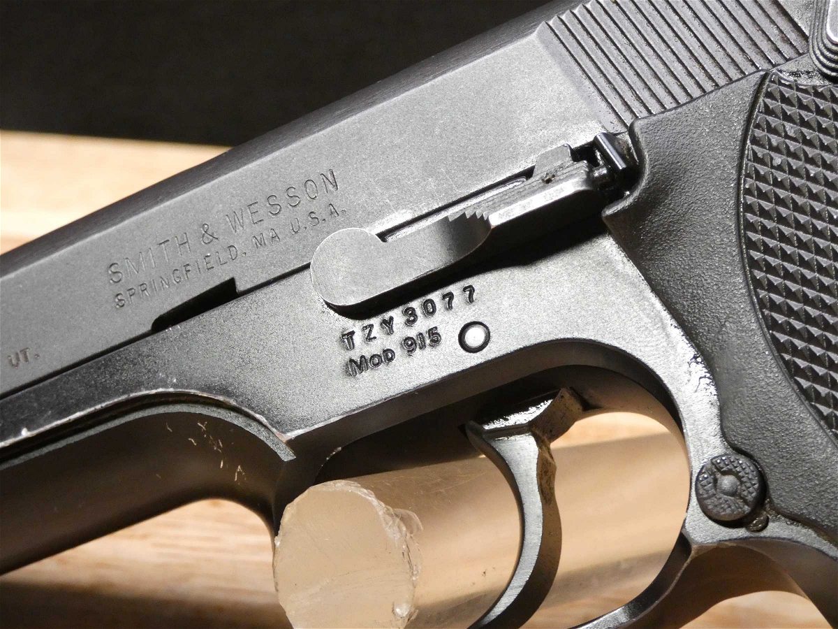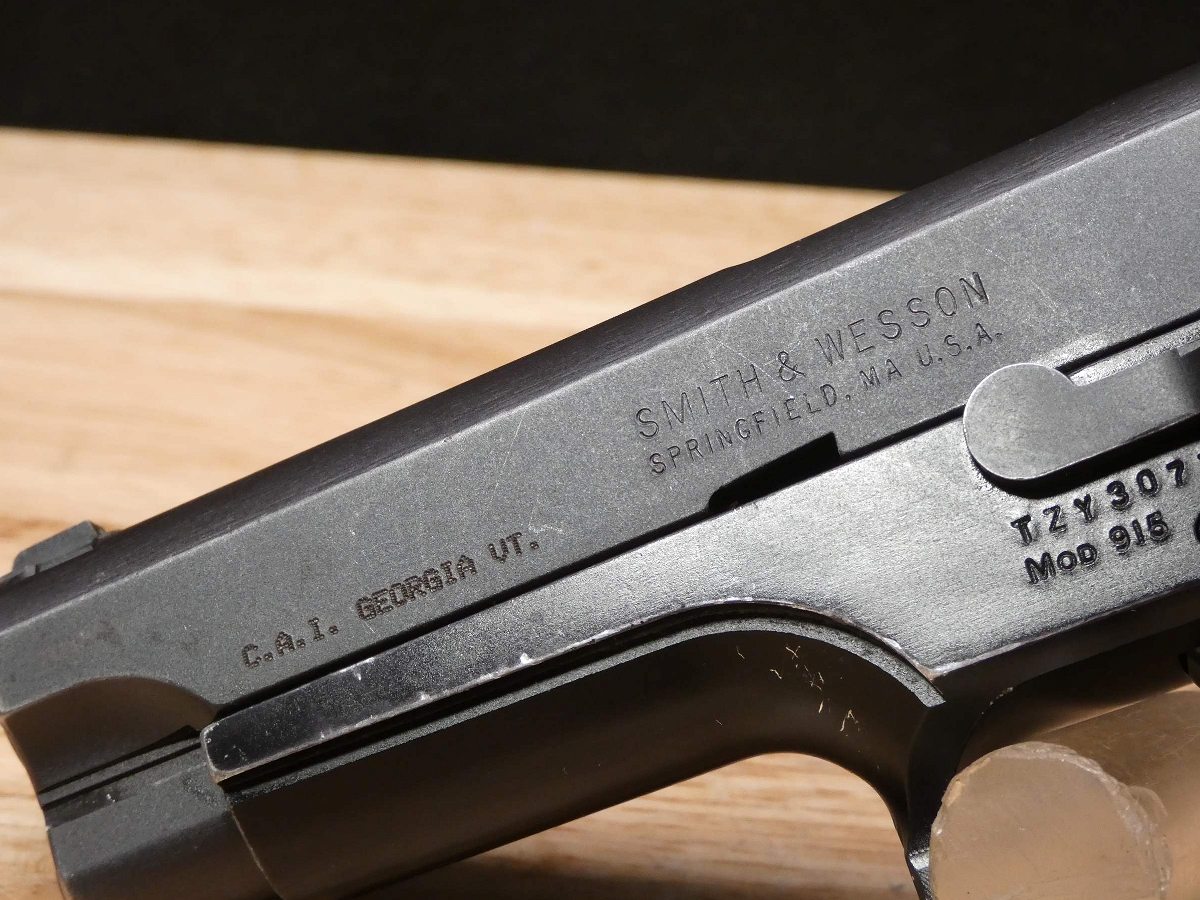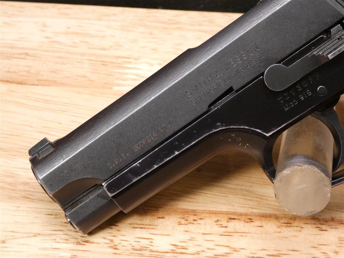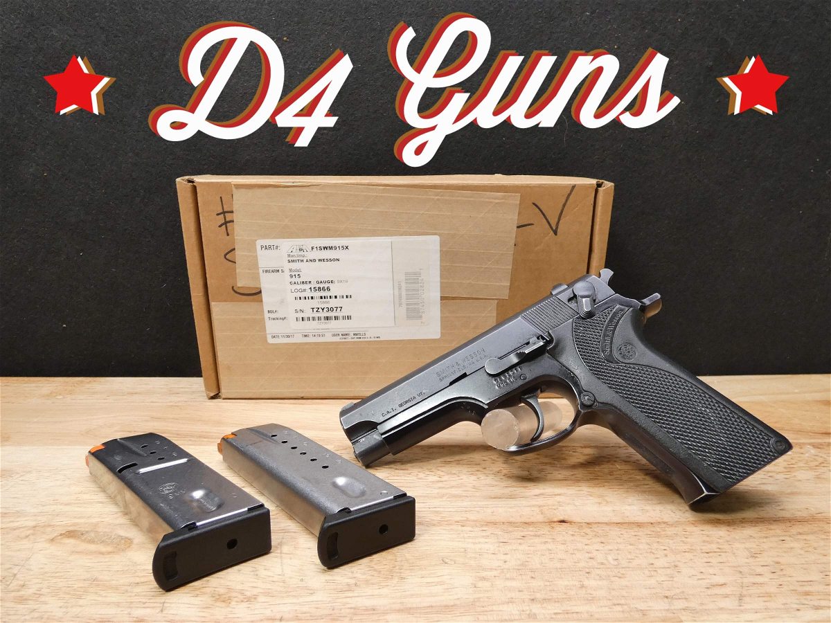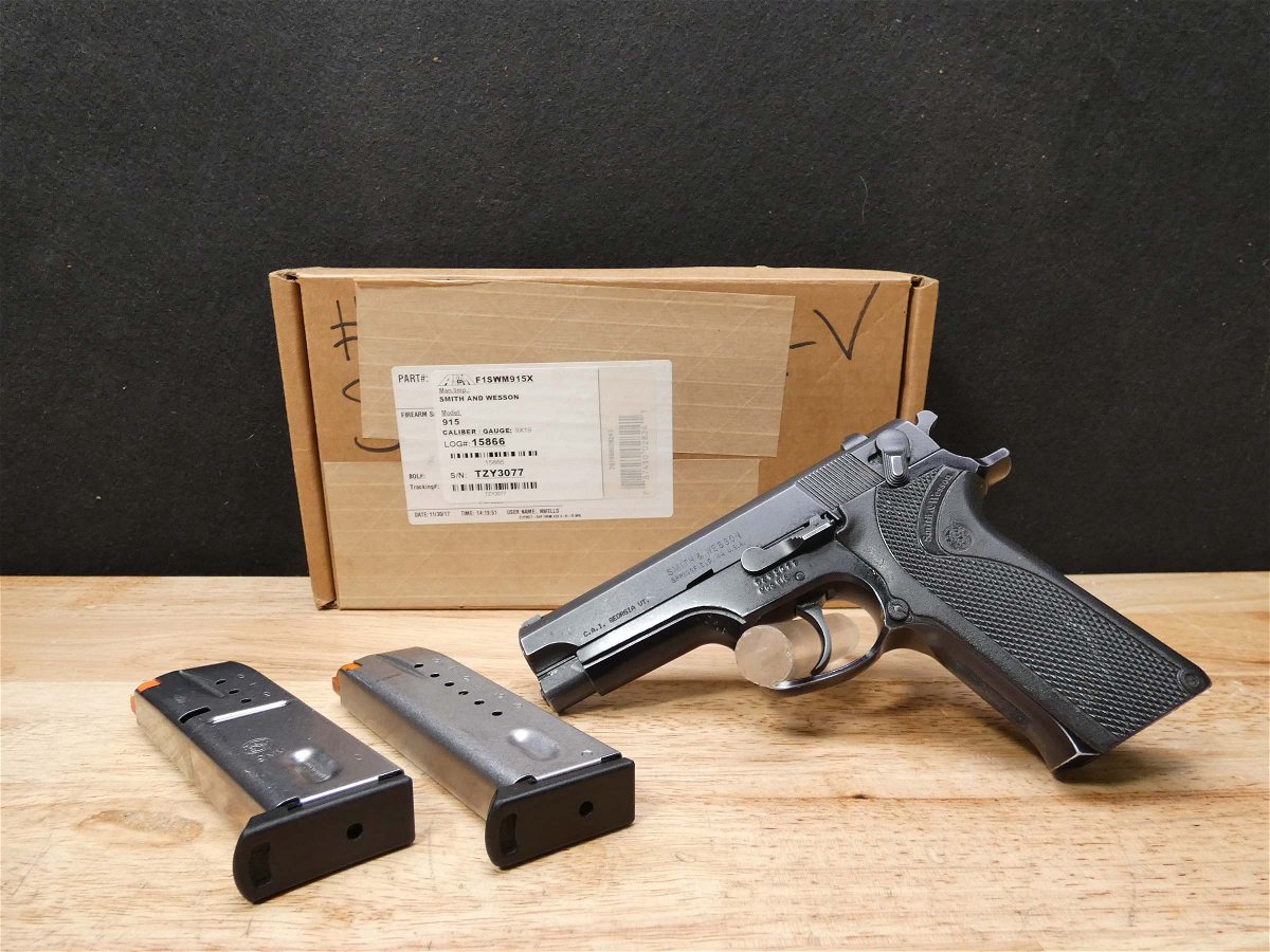 For sale is a Smith & Wesson Model 915 semi automatic pistol in 9MM. Serial number- TZY3077. This S&W 915 is in good condition and comes with a box and one 10-round magazine and one 15-round magazine. This 915 features a three point fixed sight, a 4 inch "9mm parabellum" stamped barrel, a rounded trigger guard and a left side only decocker lever/safety. The Smith & Wesson Model 915, introduced as a budget friendly 9mm semi-automatic pistol, is a personal-protection pistol which has a pronounced quality advantage over its sibling the Model 910 making it clear why this pistol has continued to have a loyal following many years after being discontinued. V2-E1 Barrel Length: 4 Bore condition: Excellent