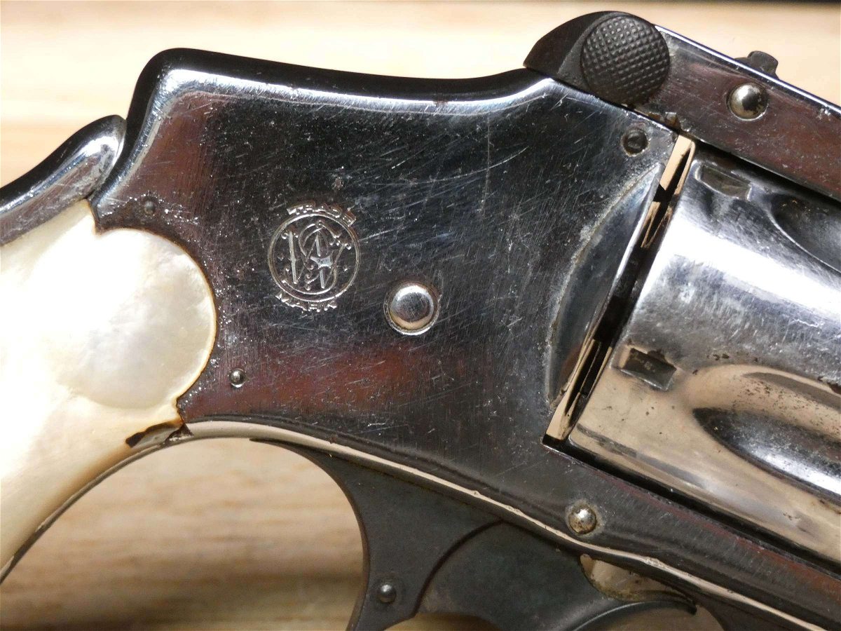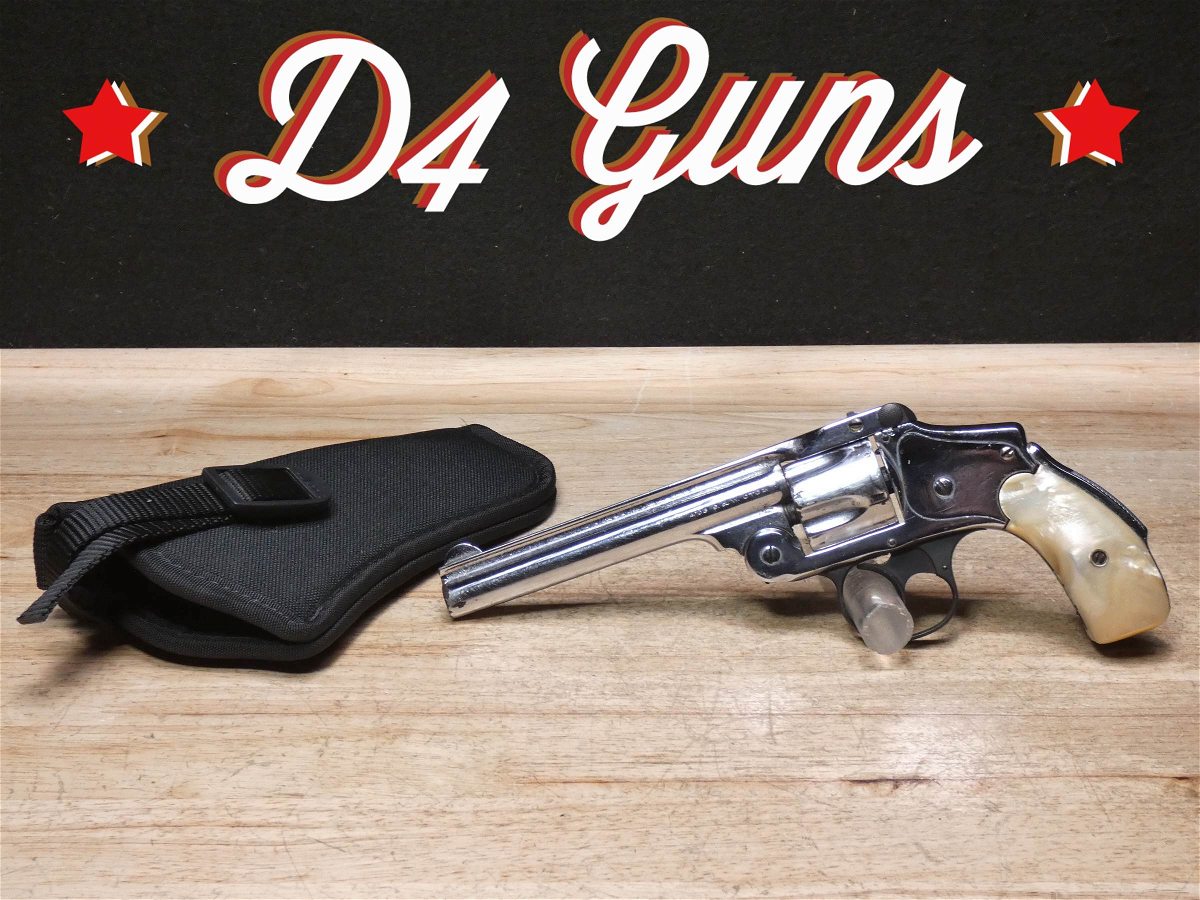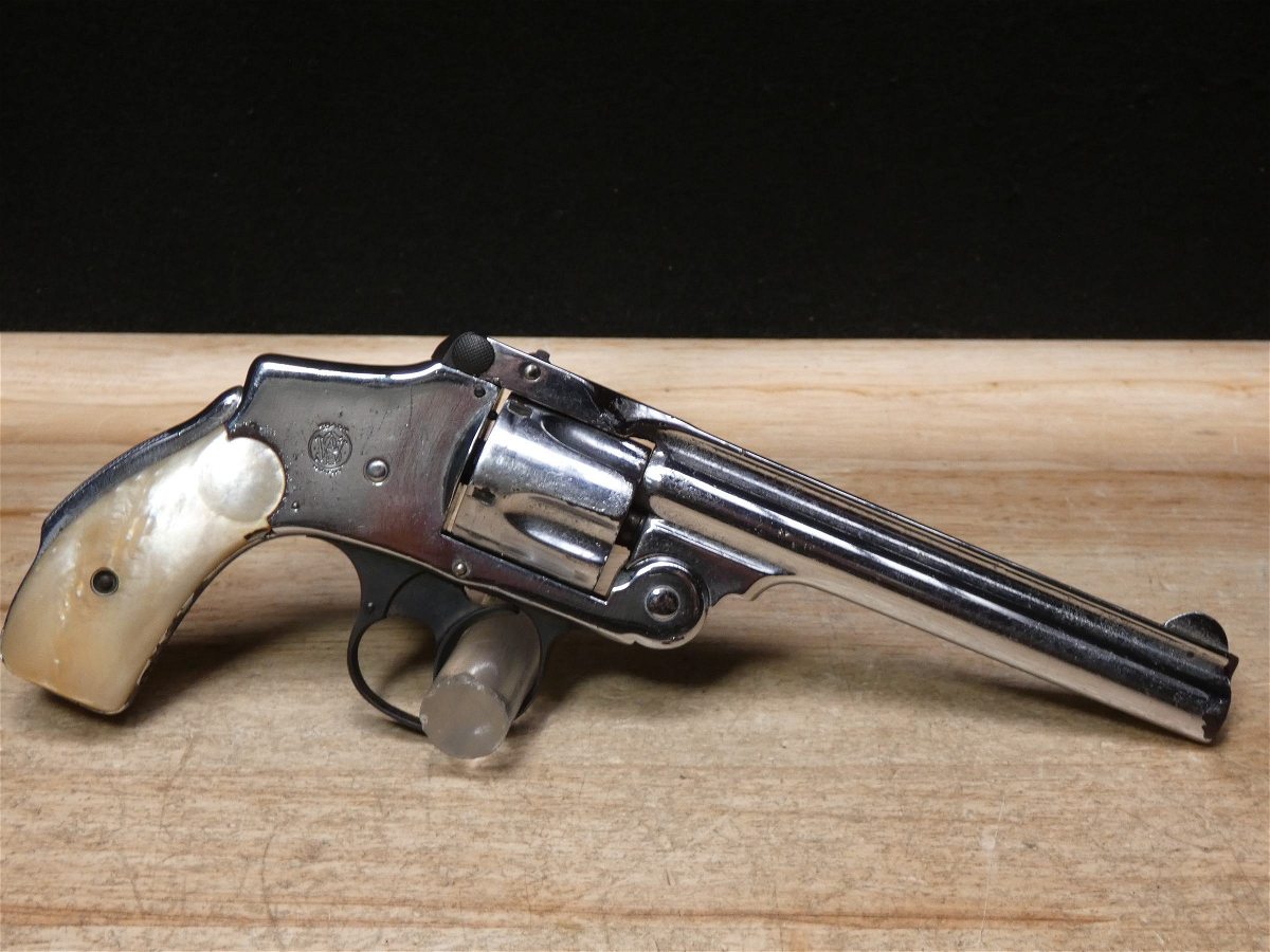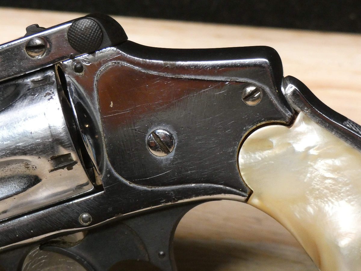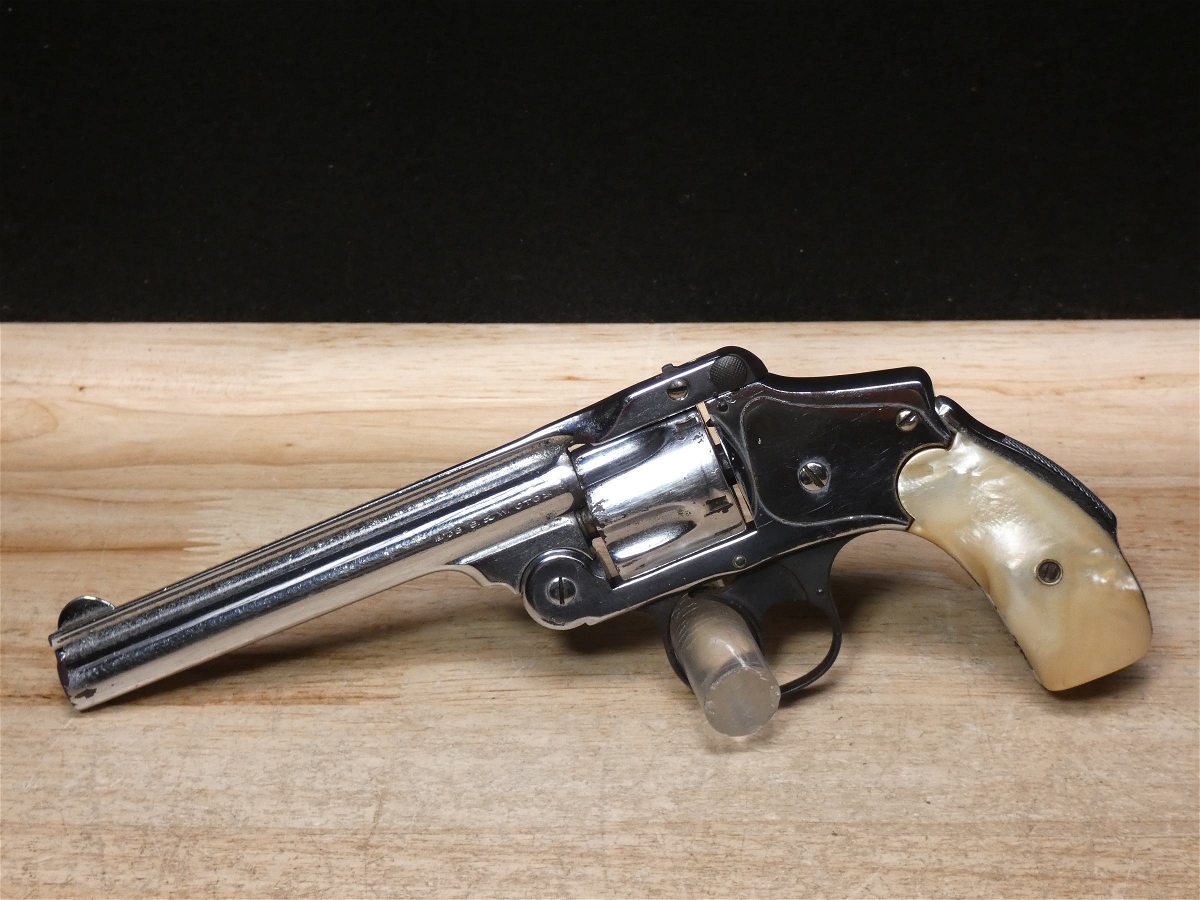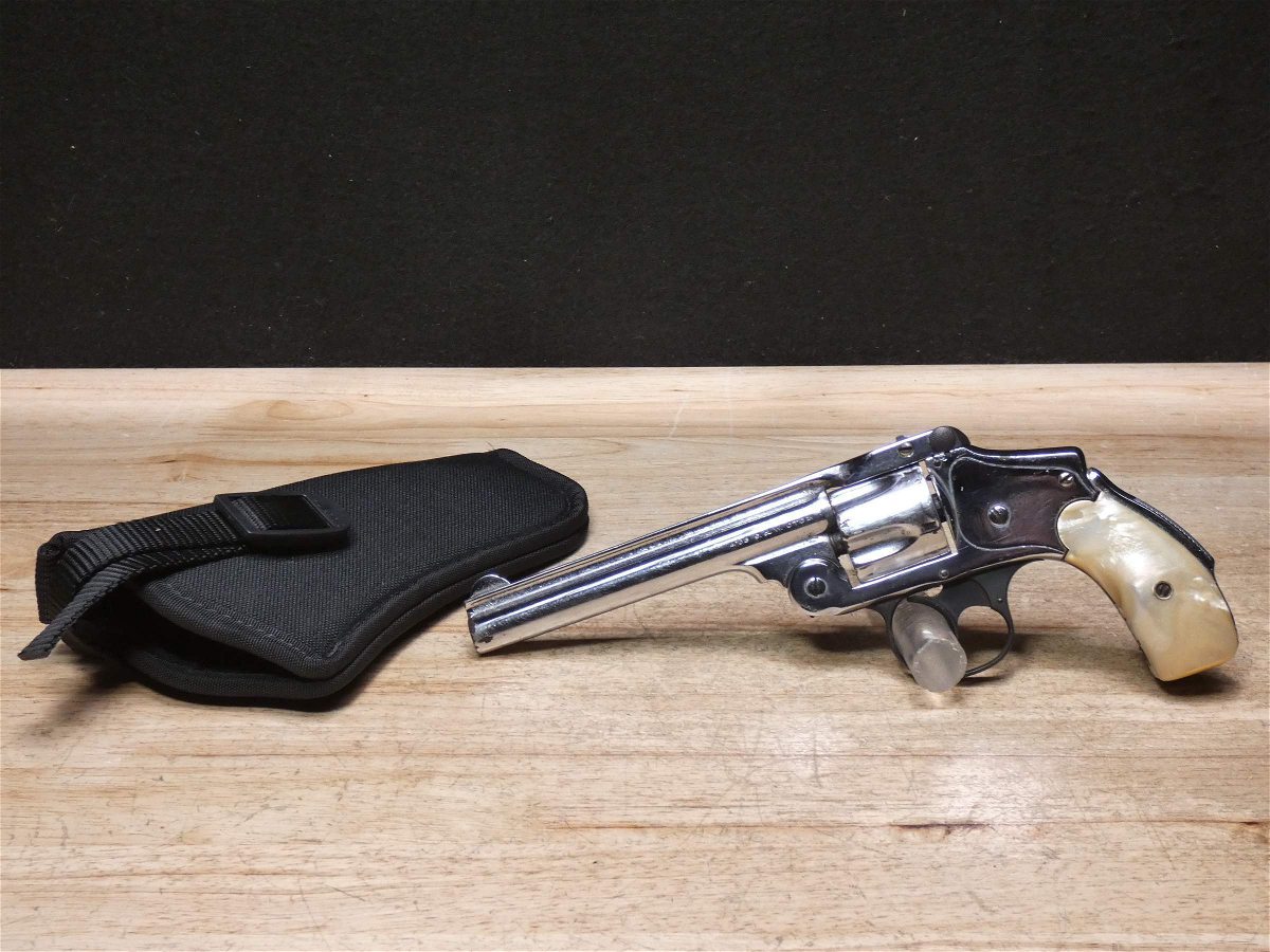 For sale is a Smith & Wesson Safety Hammerless 3rd Model top-break revolver in .32 S&W. Serial number-189386. This revolver is in fair condition, however, there is some finish wear on the barrel, cylinder, and frame. There is also some rust present underneath the pearl grips. The bore also has some pitting. Mechanically, this firearm functions well for its age with proper timing and tight lock up. This revolver features a nickel finish, REAL PEARL GRIPS, a 5-inch barrel, and comes with a holster.