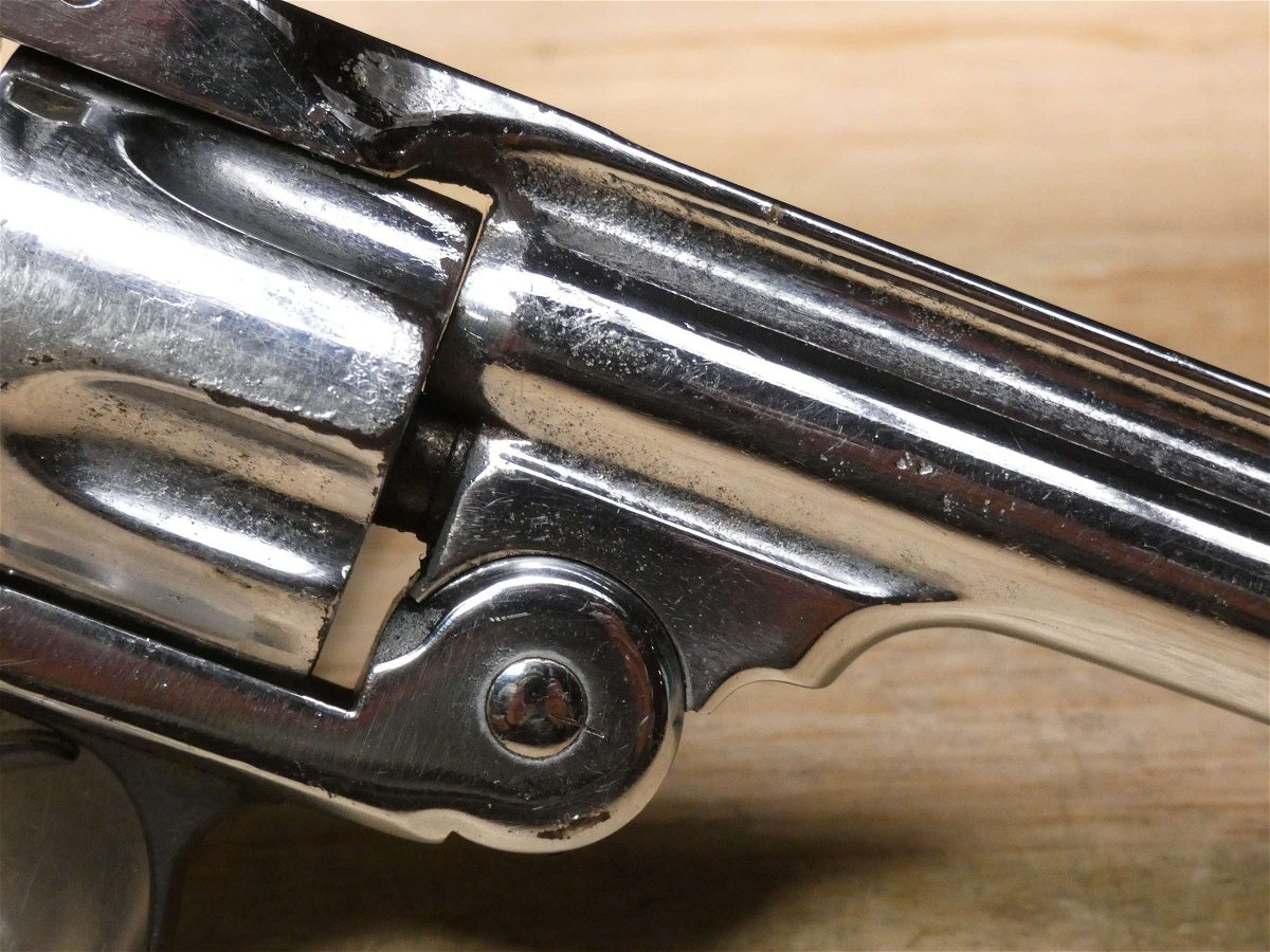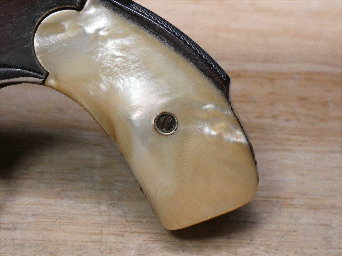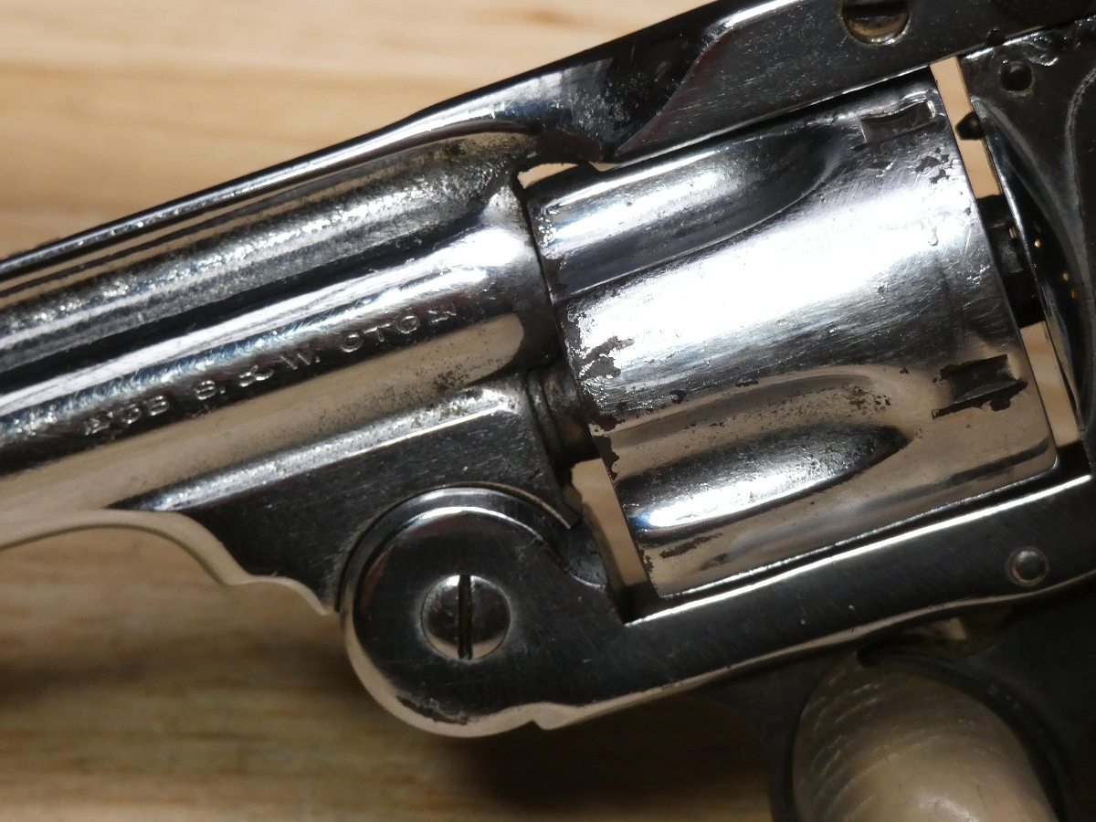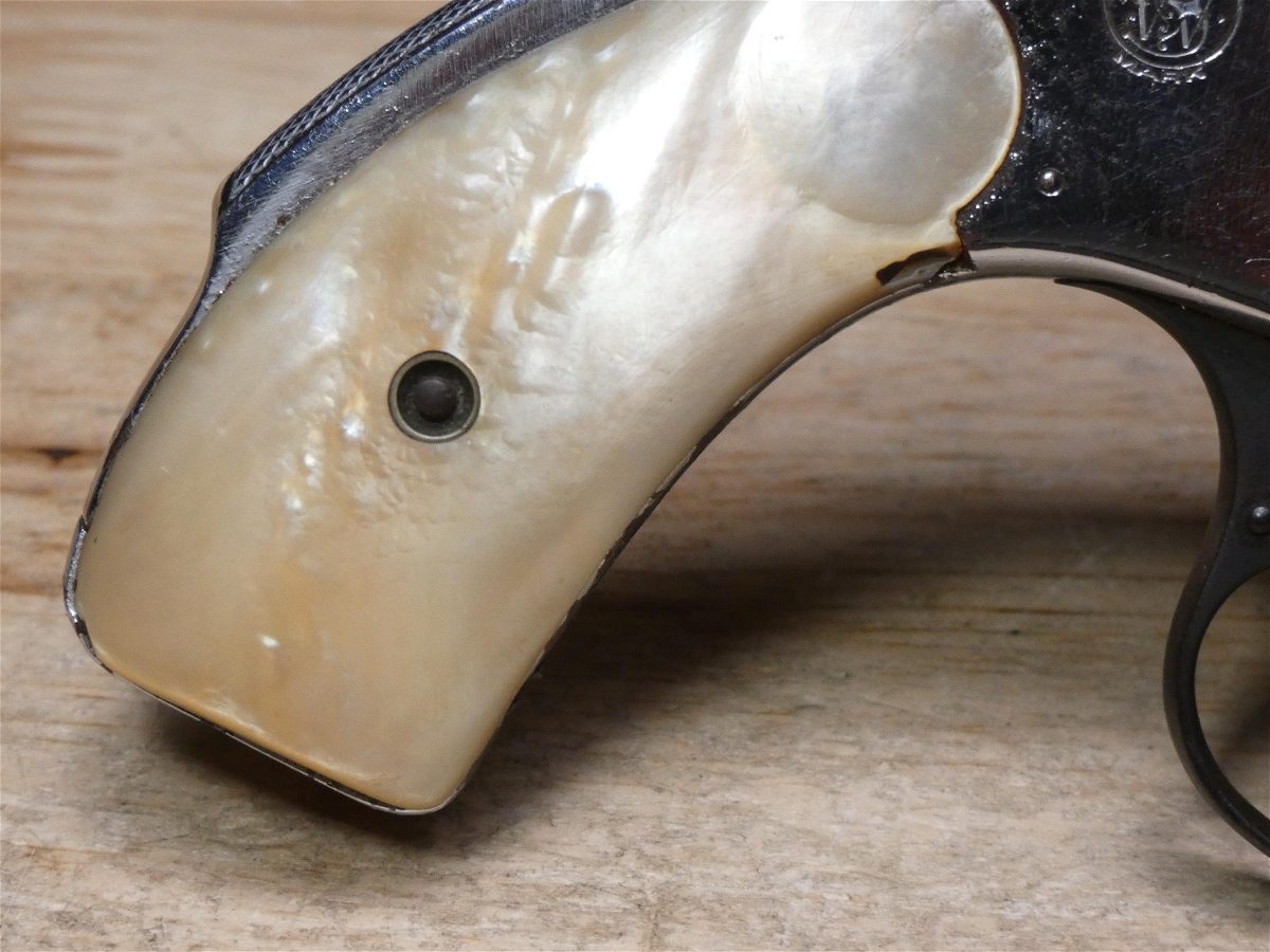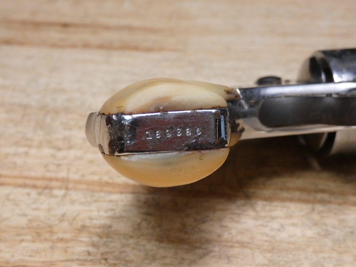 For sale is a Smith & Wesson Safety Hammerless 3rd Model top-break revolver in .32 S&W. Serial number-189386. This revolver is in fair condition, however, there is some finish wear on the barrel, cylinder, and frame. There is also some rust present underneath the pearl grips. The bore also has some pitting. Mechanically, this firearm functions well for its age with proper timing and tight lock up. This revolver features a nickel finish, REAL PEARL GRIPS, a 5-inch barrel, and comes with a holster.
