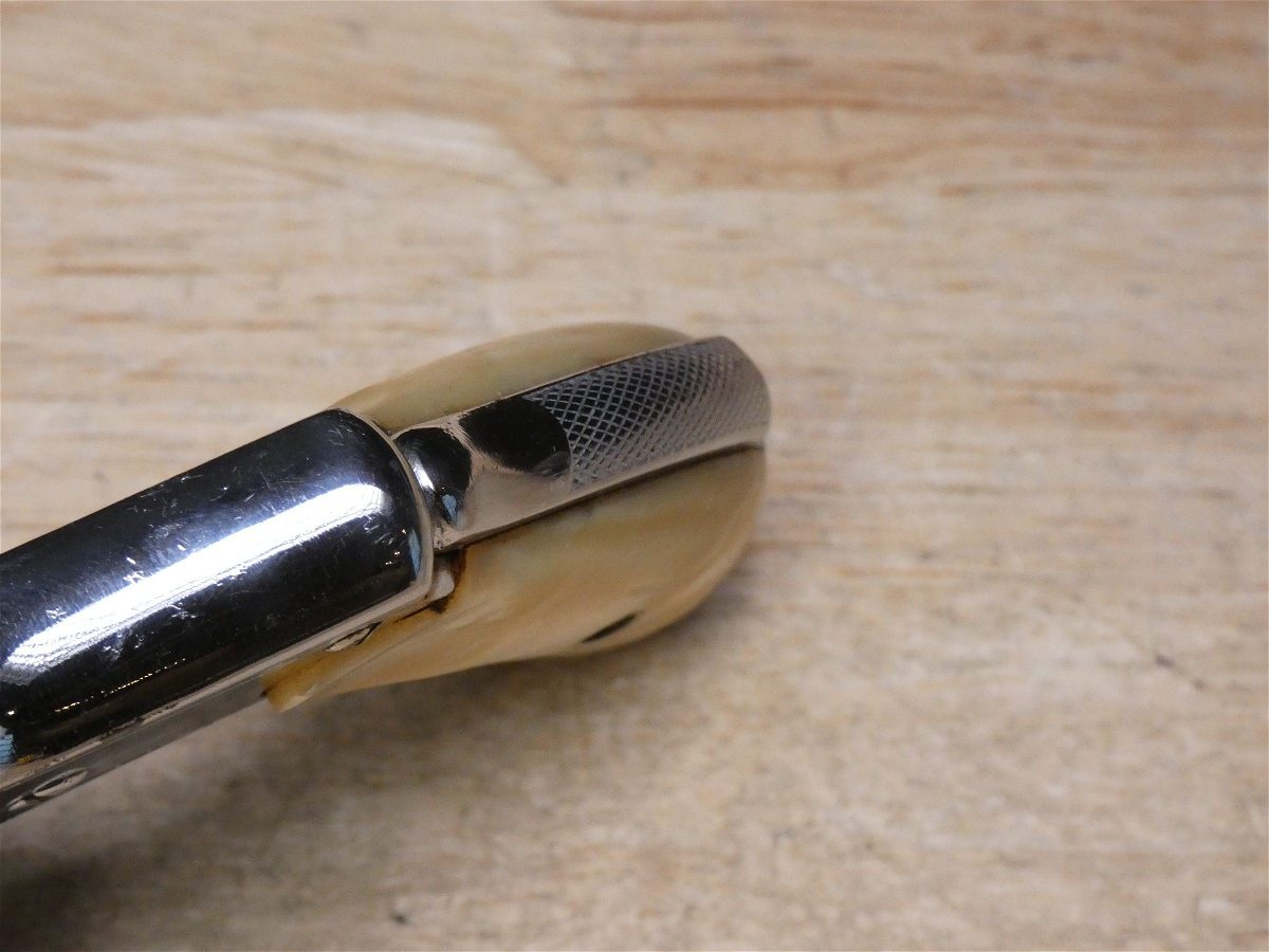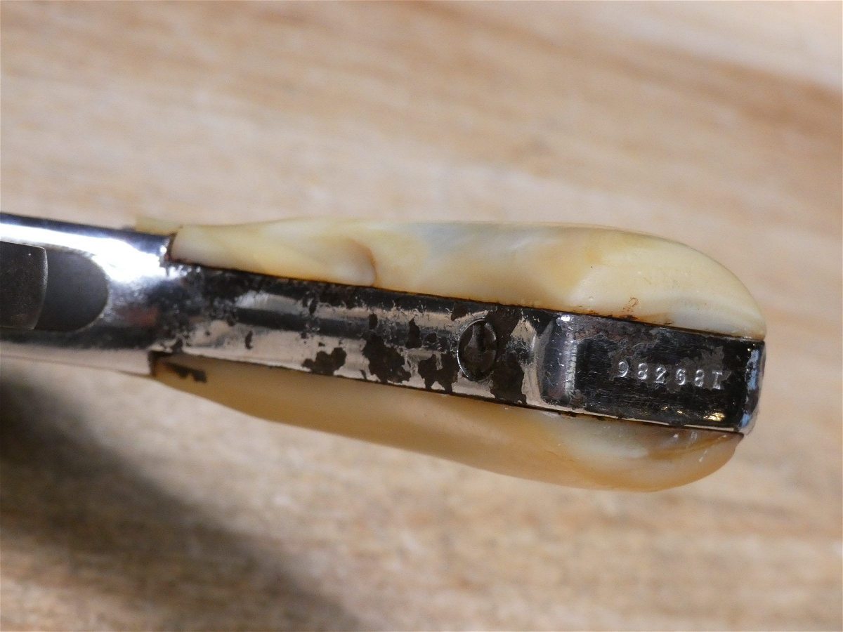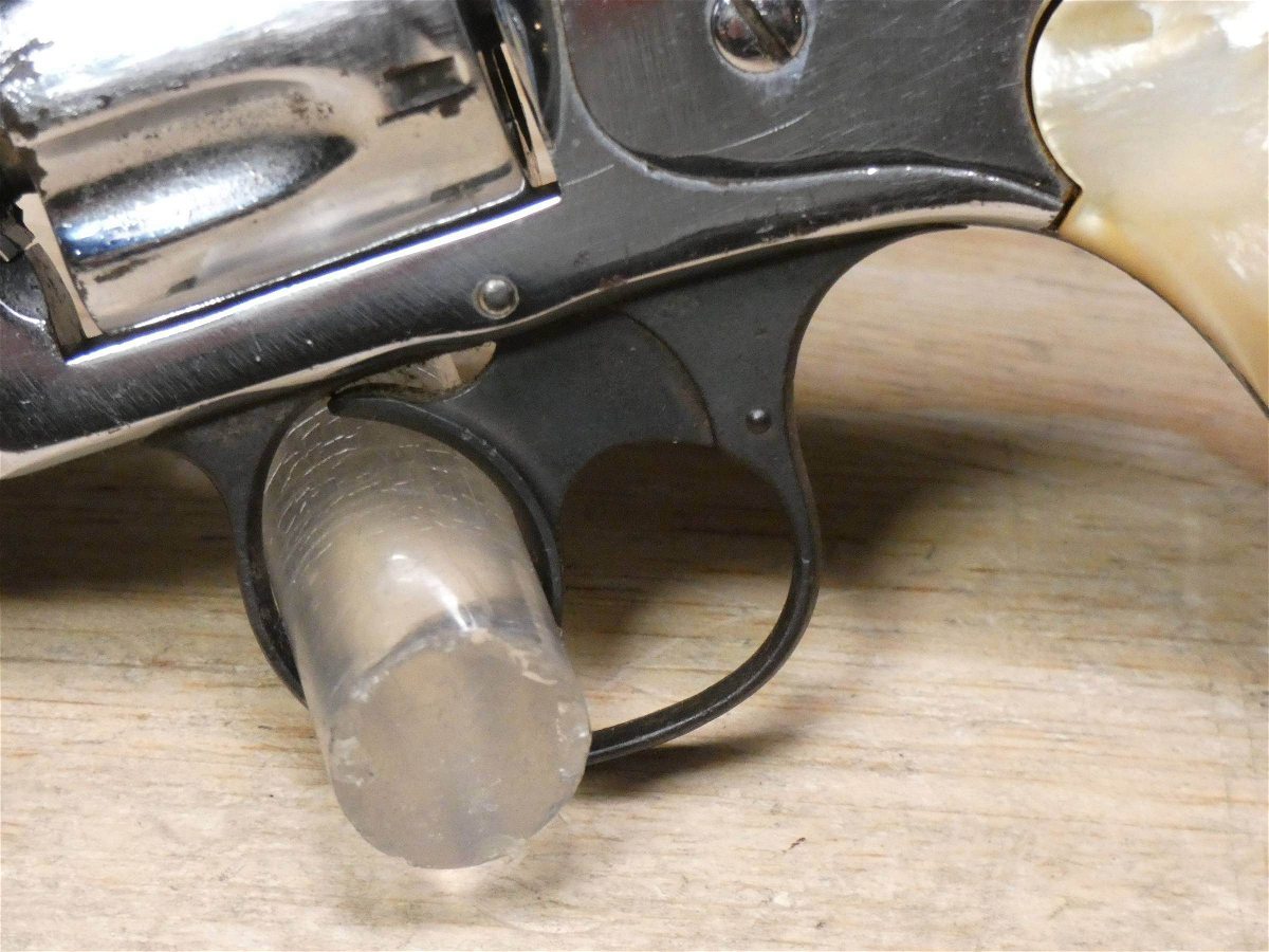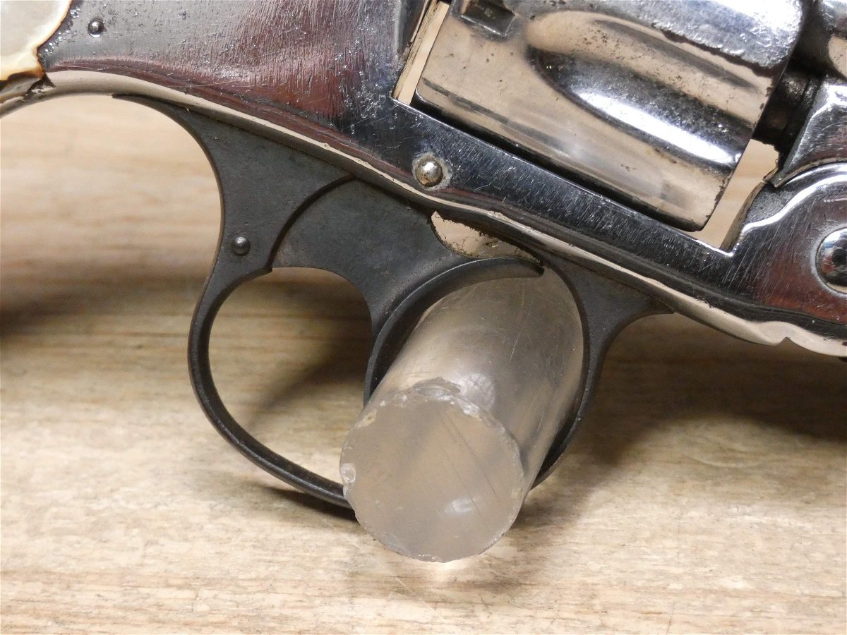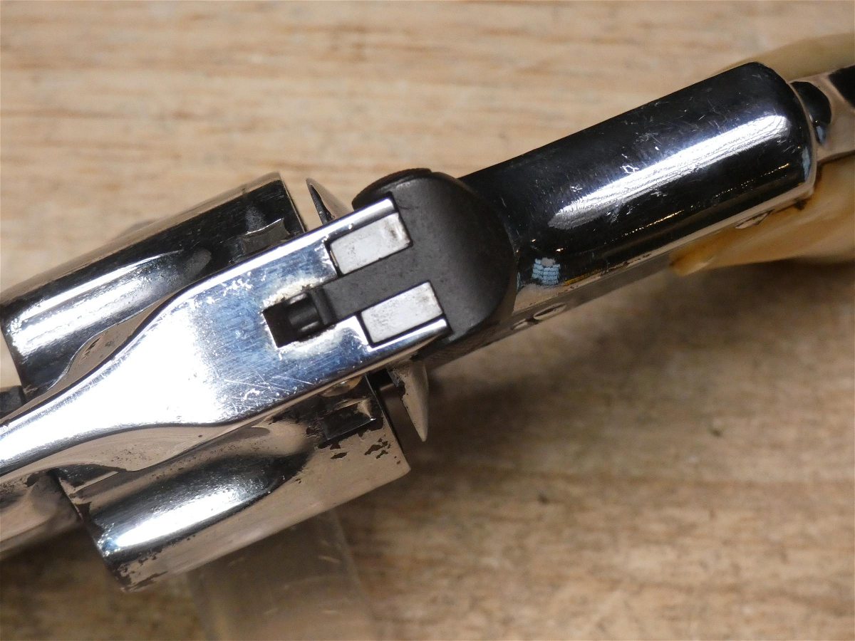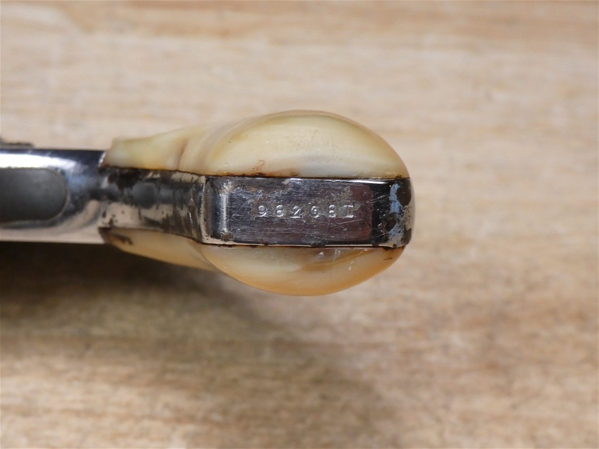 For sale is a Smith & Wesson Safety Hammerless 3rd Model top-break revolver in .32 S&W. Serial number-189386. This revolver is in fair condition, however, there is some finish wear on the barrel, cylinder, and frame. There is also some rust present underneath the pearl grips. The bore also has some pitting. Mechanically, this firearm functions well for its age with proper timing and tight lock up. This revolver features a nickel finish, REAL PEARL GRIPS, a 5-inch barrel, and comes with a holster.