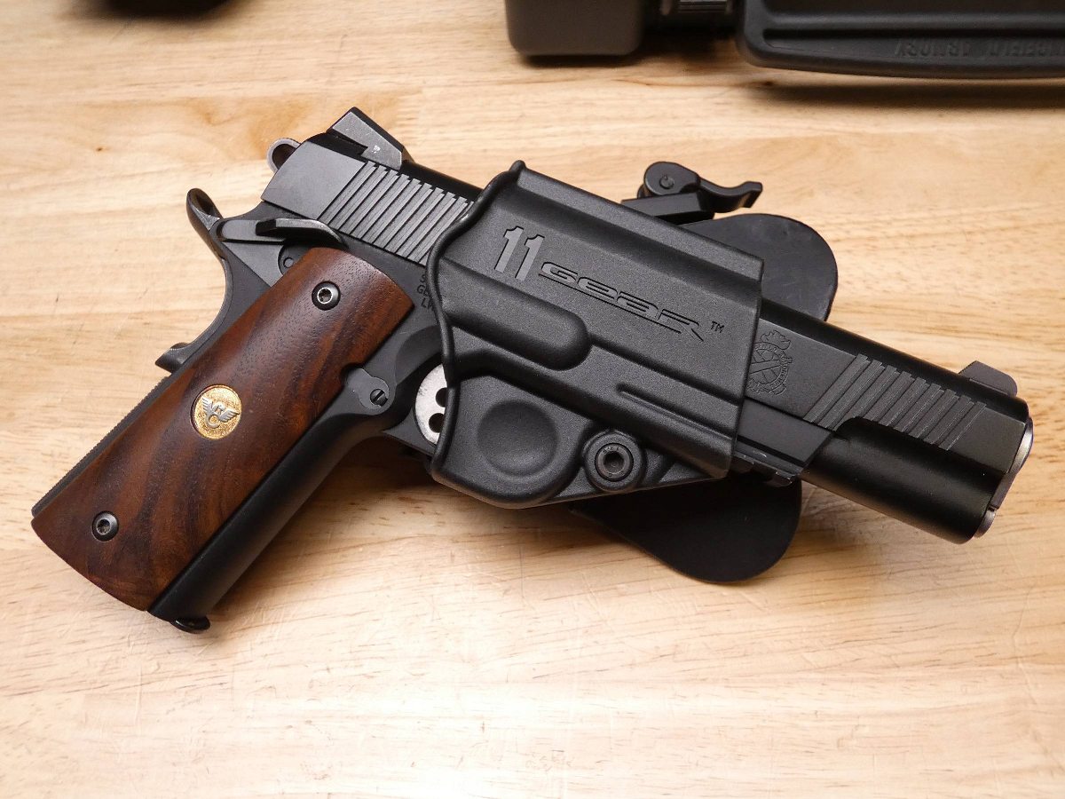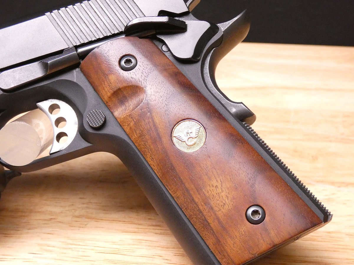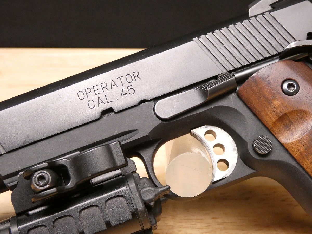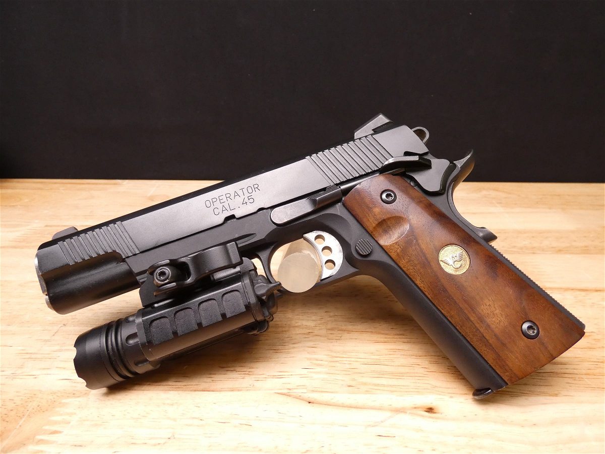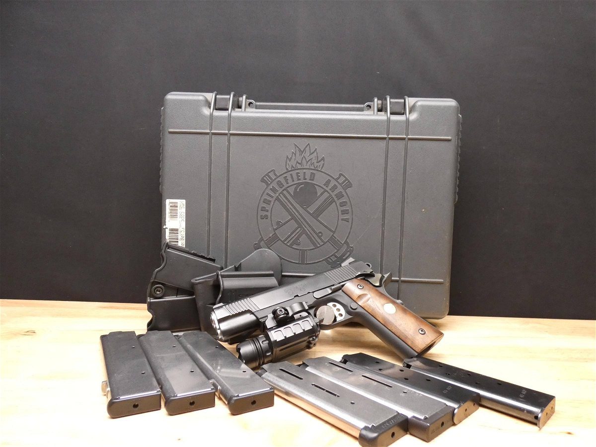 For sale is a Springfield Operator semi-automatic pistol in .45ACP. Serial number-LW140036. This pistol is in great condition and comes with the original case, manual, and (7) magazines, 3 of which are extended. 6 of the 7 mags are Wilson Combat Mags, one is factory Springfield. Features a 400 Lumen UTG tactical light, holster and mag holster, Wilson Combat smooth burl wood grips with gold medallions are installed on the pistol and an extended ambidextrous thumb safety along with a 5" stainless steel match-grade barrel and fitted bushing to render custom shop performance at a production price. Fixed steel no-snag tactical sights include three tritium vials for superior low-light performance. An extended lightweight single-action trigger sets the standard for precision presses. With a lightweight delta hammer and extended beavertail grip safety.