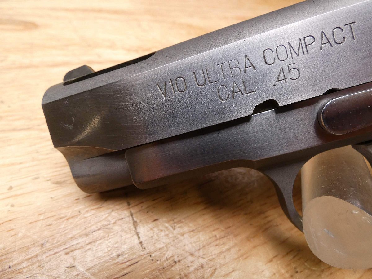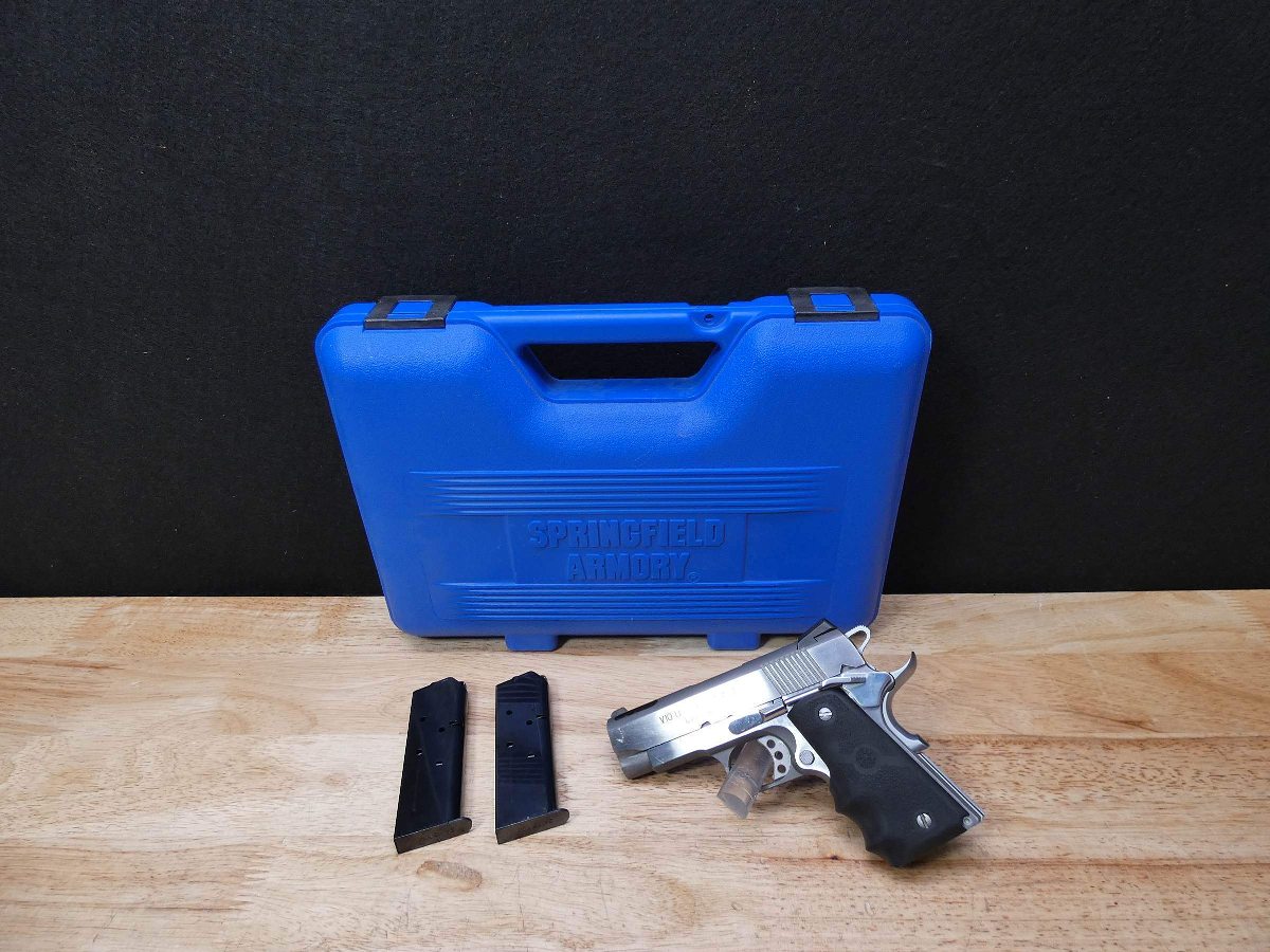 For sale is a Springfield V10 Ultra Compact semi-automatic pistol in .45 ACP. Serial number- N415340. This pistol is in good condition with a good bore and comes with the original case, and two 6-round Springfield mags. The 3.5" bushingless bull barrel is ported. This gun features contoured rubber Hogue grips, a Novak-style rear sight, and a skeletonized trigger. Please refer to photos for exact surface condition. V2-J3 Barrel Length: 3.25 Bore condition: Good