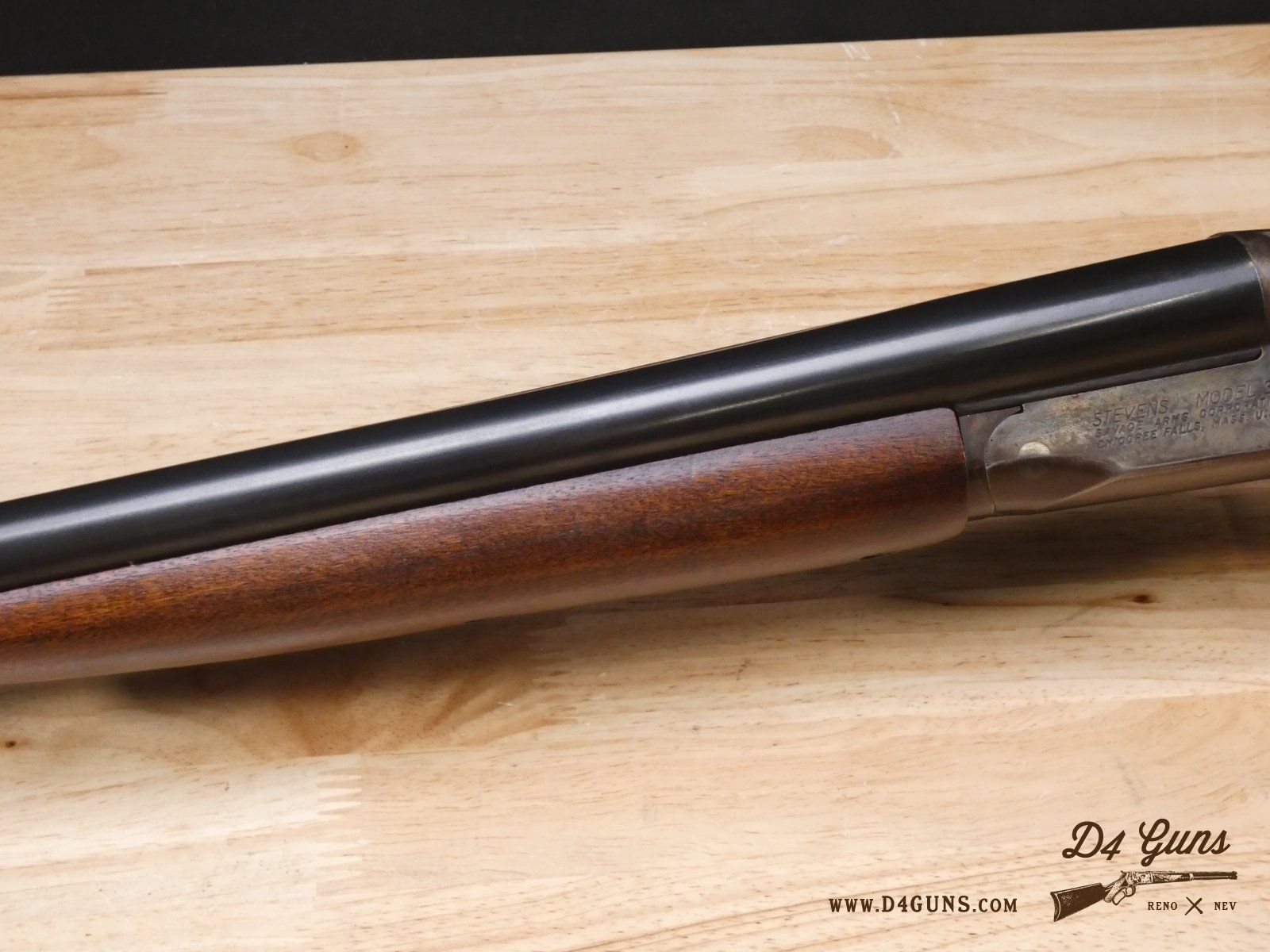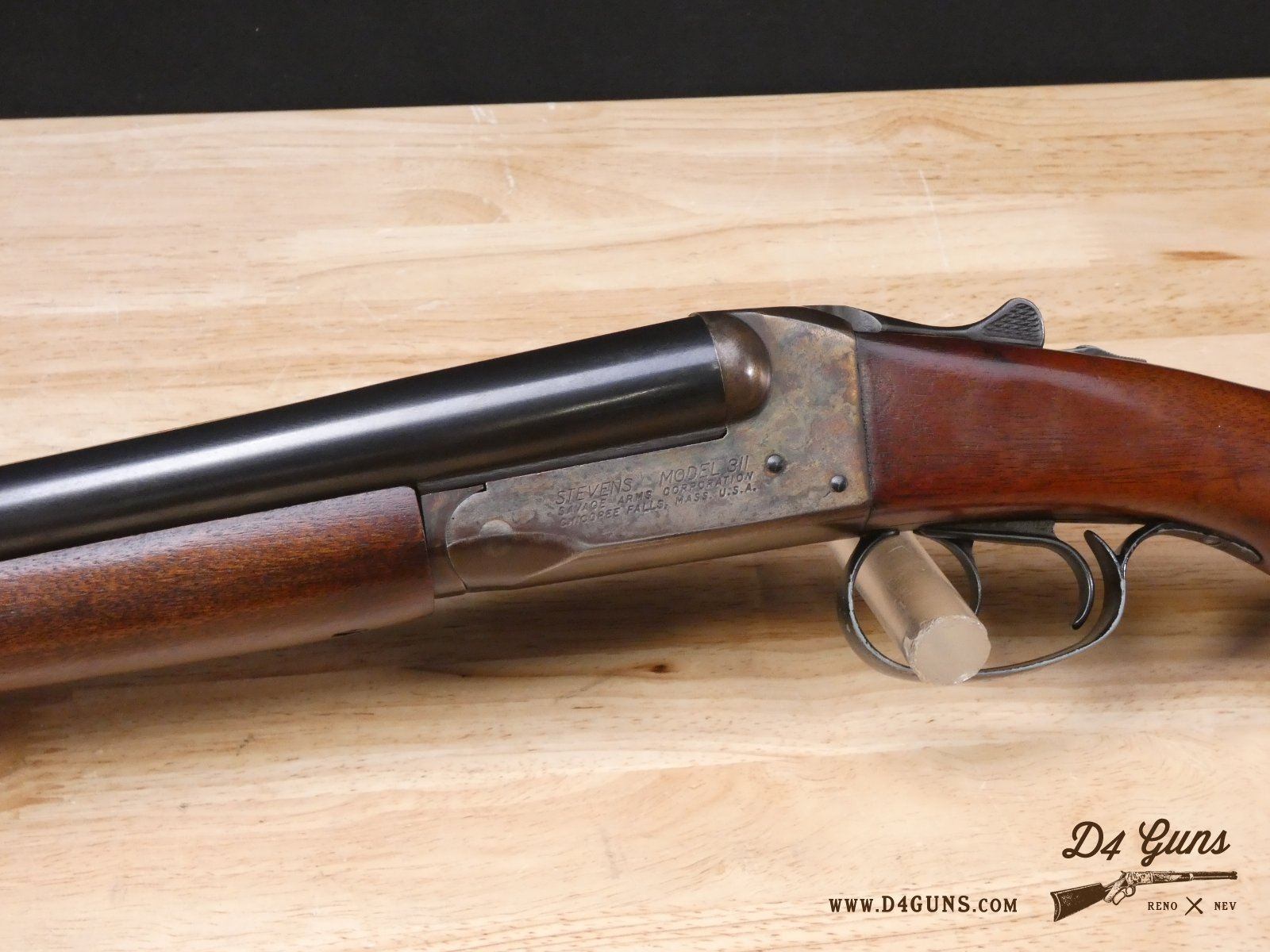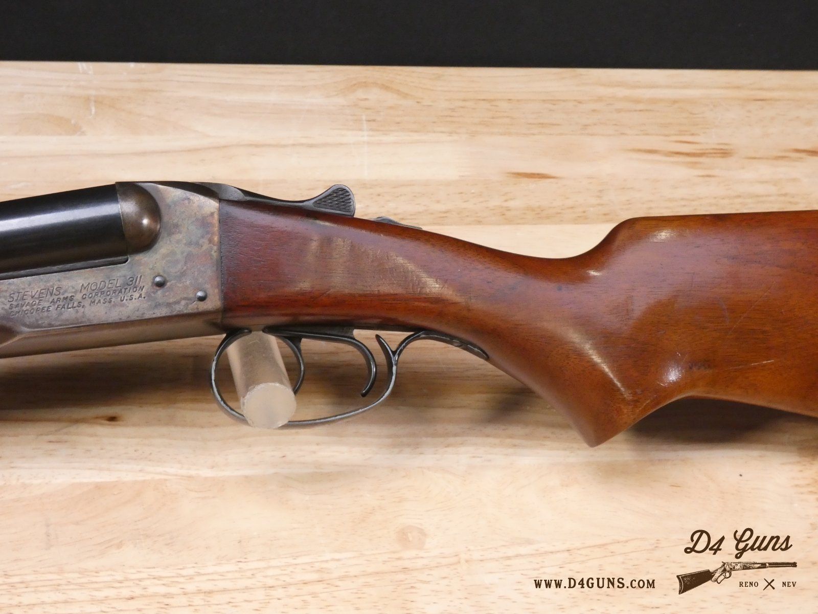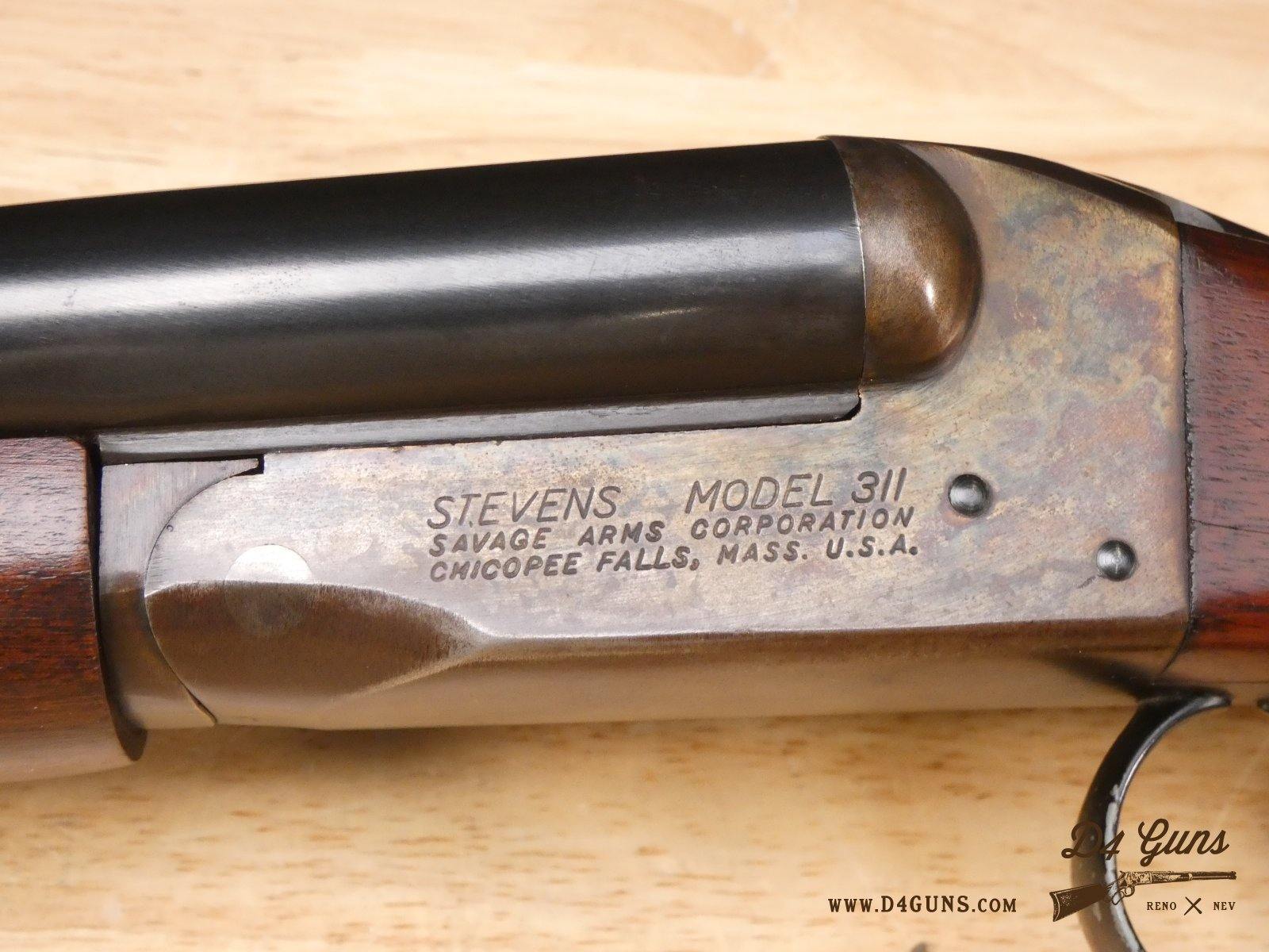For sale is a Stevens Model 311A side-by-side shotgun in 12 gauge. Serial number-none. This shotgun features a case hardened receiver, extractors, 13" length of pull to the rearward trigger, 2 3/4" chamber, and we believe modified and full fixed chokes. Please refer to the photos as there are minor nicks and dings on the stock and bluing wear on the barrel. V2-B1 Barrel Length: 28 Bore condition: Excellent