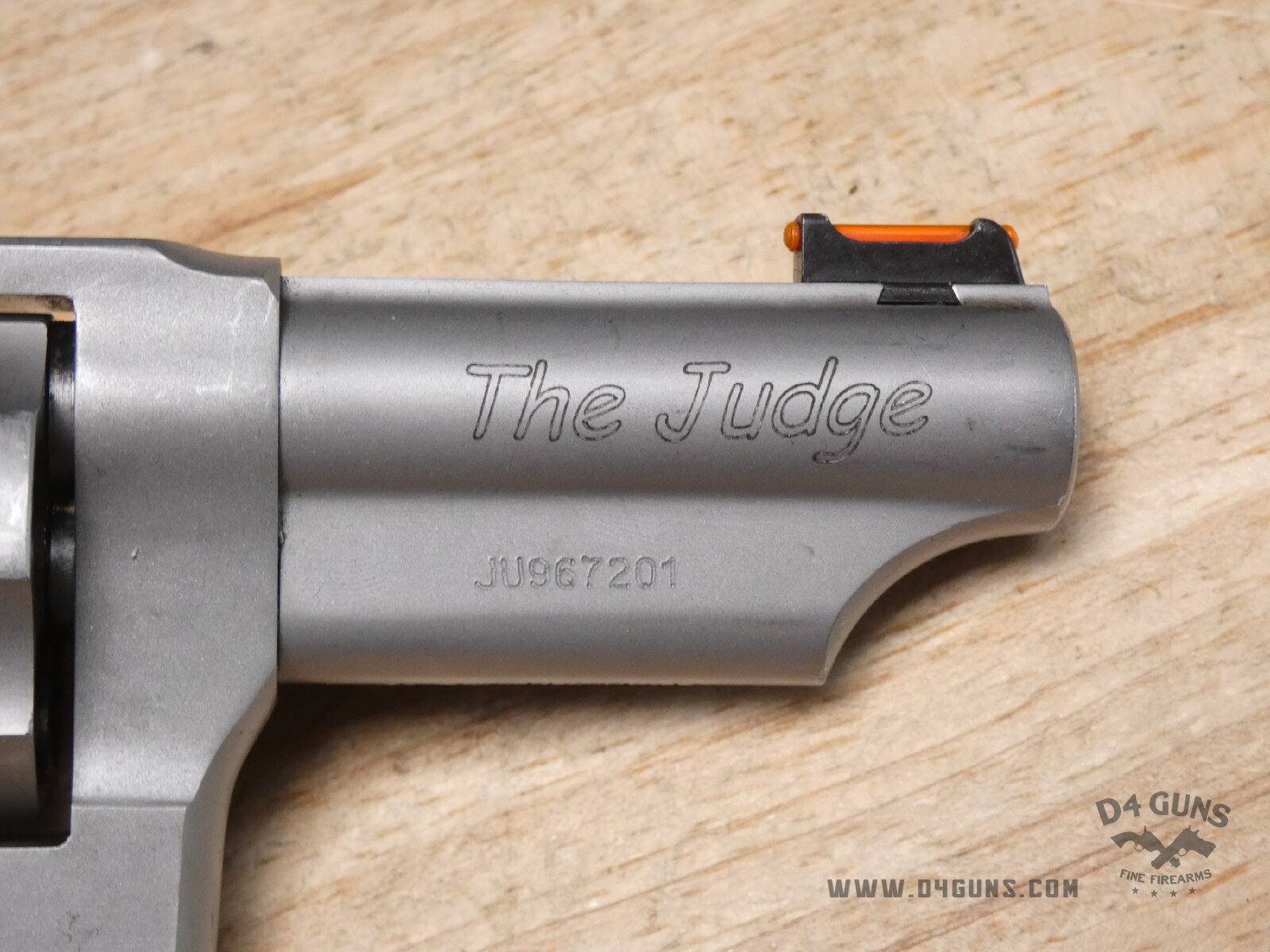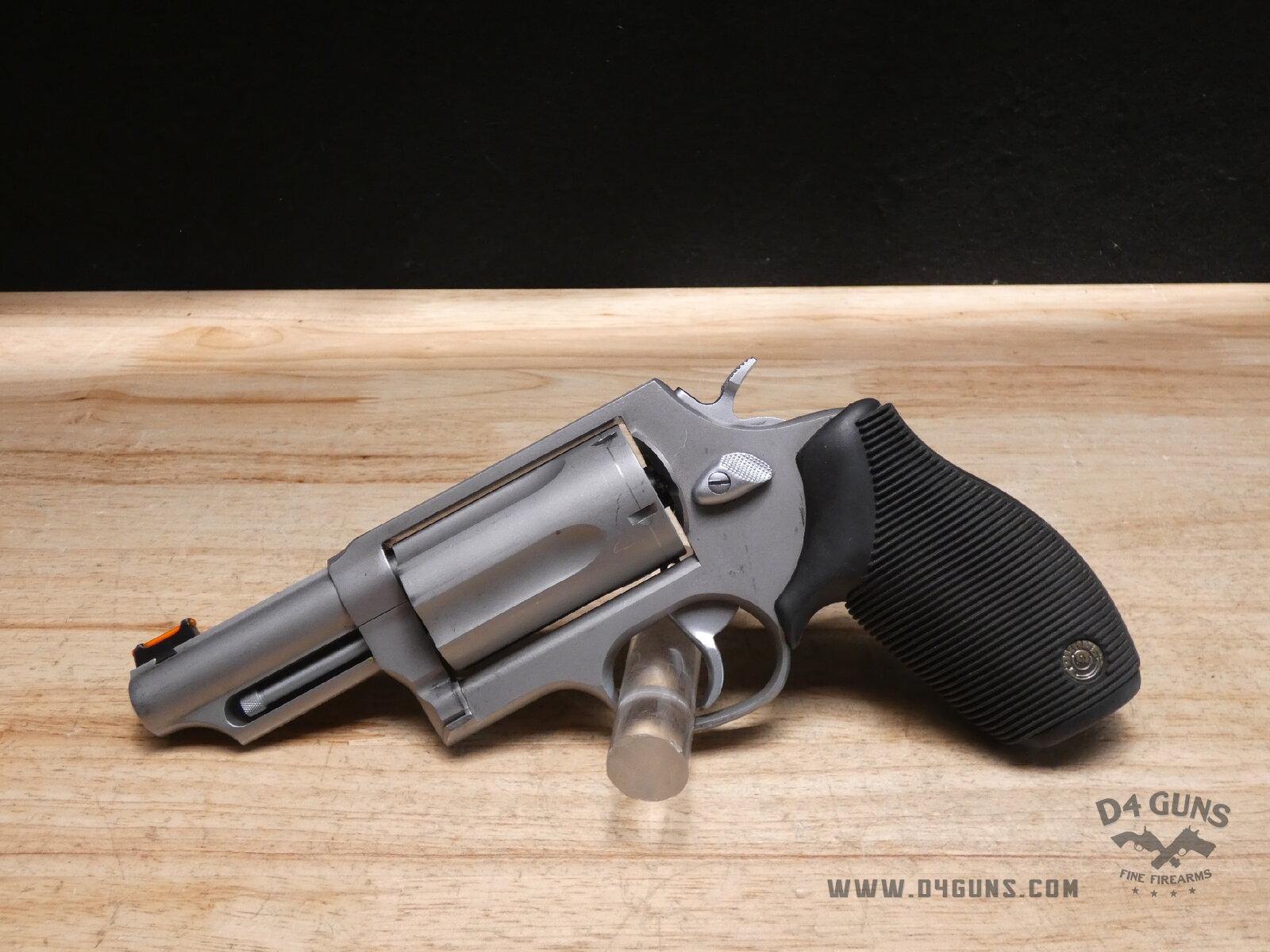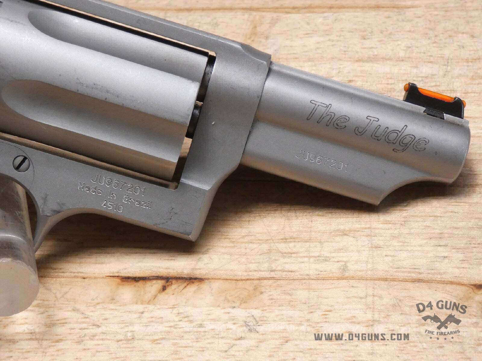 Up for grabs is a Taurus Judge revolver in .45LC/.410ga. Serial number- JU67201. More than a decade since it was first introduced, the legendary Taurus Judge still rules. Capable of chambering both 45 Colt and 410 shotshells, it's the original five-shot game changer. Comes with the original box. V2-I4 Barrel Length: 3 Bore condition: Fair