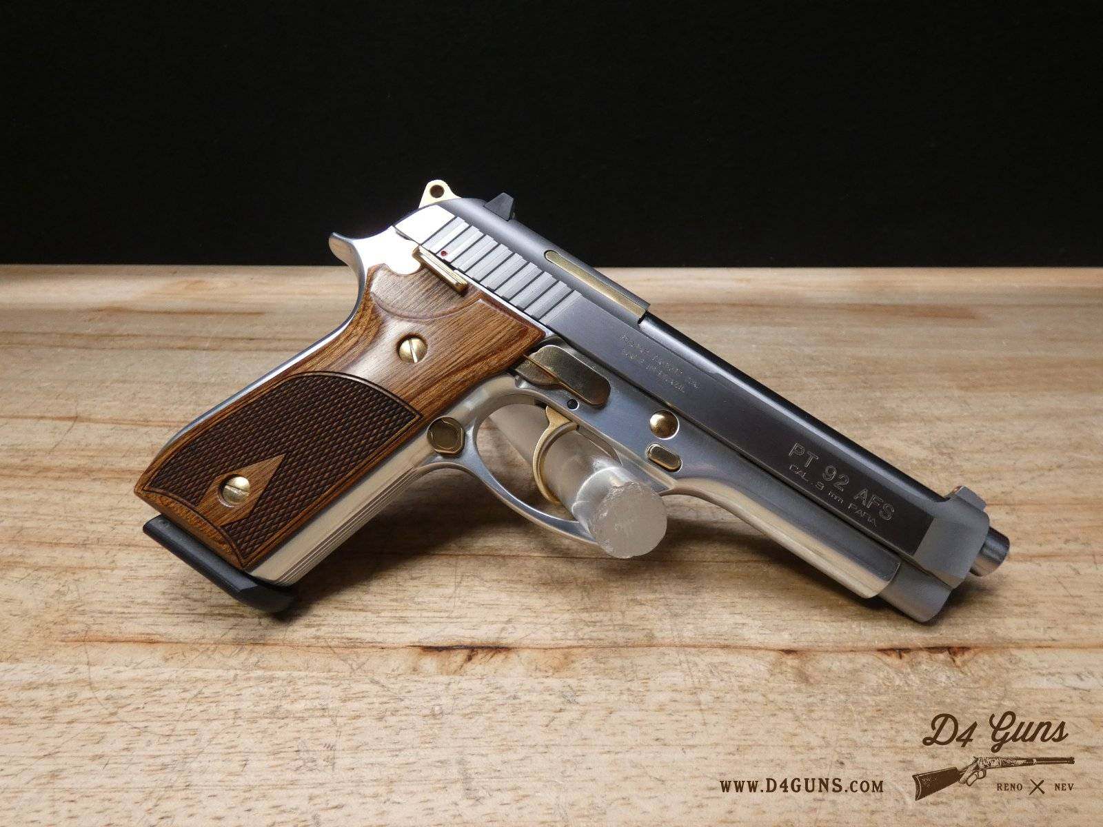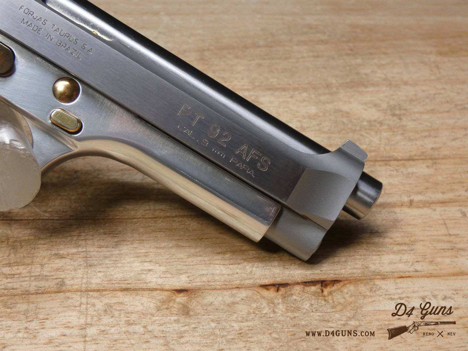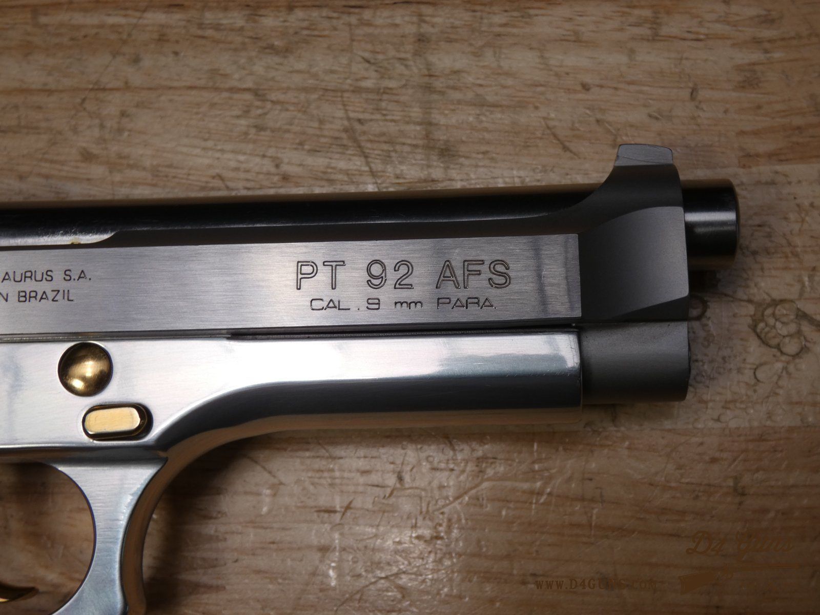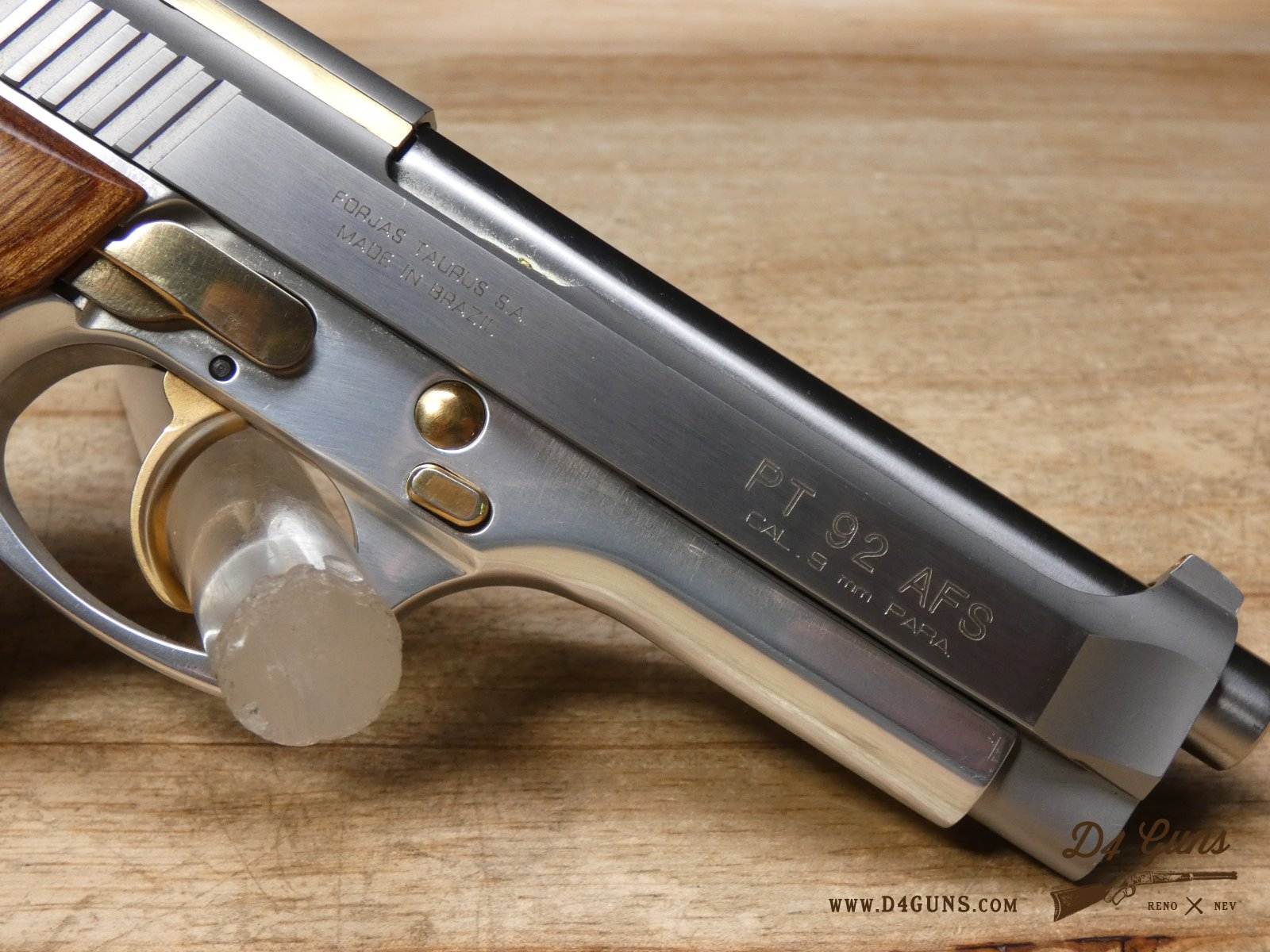 For sale is a Taurus Model PT AFS semi-automatic pistol in 9mm. Serial number- TTD96672. This pistol comes with wooden grips and two 10-round magazines. The Taurus PT92 is a double-action/single-action, 9mm, double-stack-magazine fed, short recoil-operated, semi-automatic pistol manufactured by Taurus in the former Beretta factory in São Paulo, Brazil. This pistol looks to have a stainless finish with golden trim/furnisher. Includes a leather holster as well! V2-J2 Barrel Length: 5 Bore condition: Good