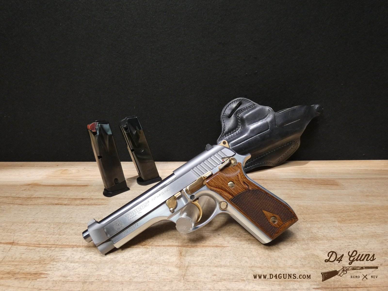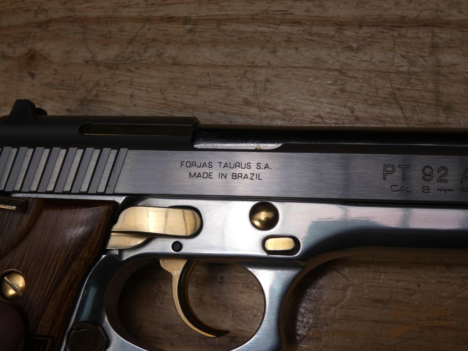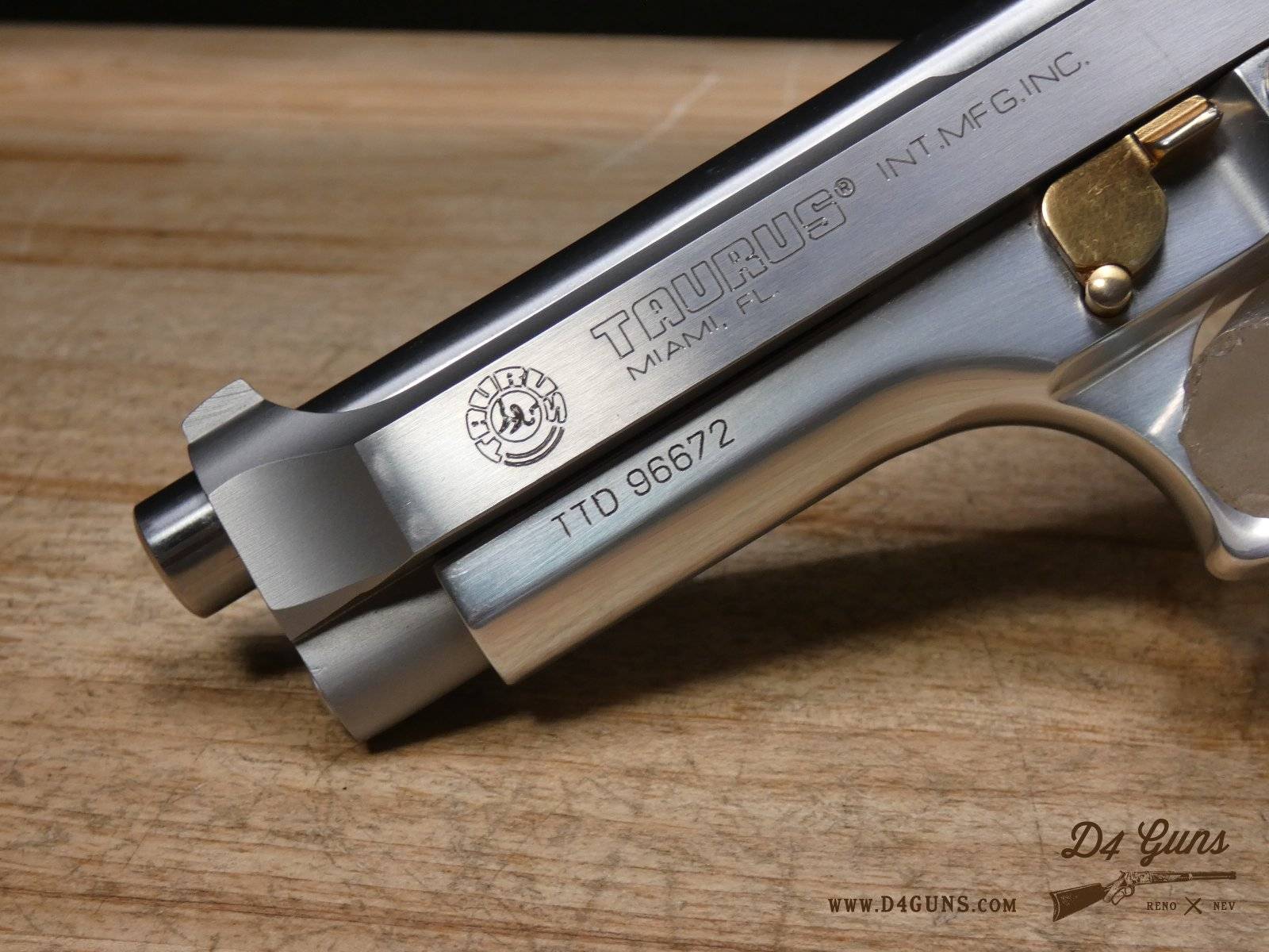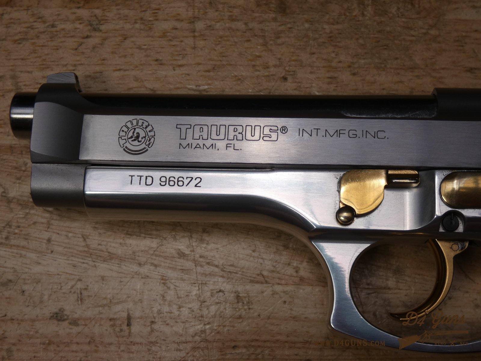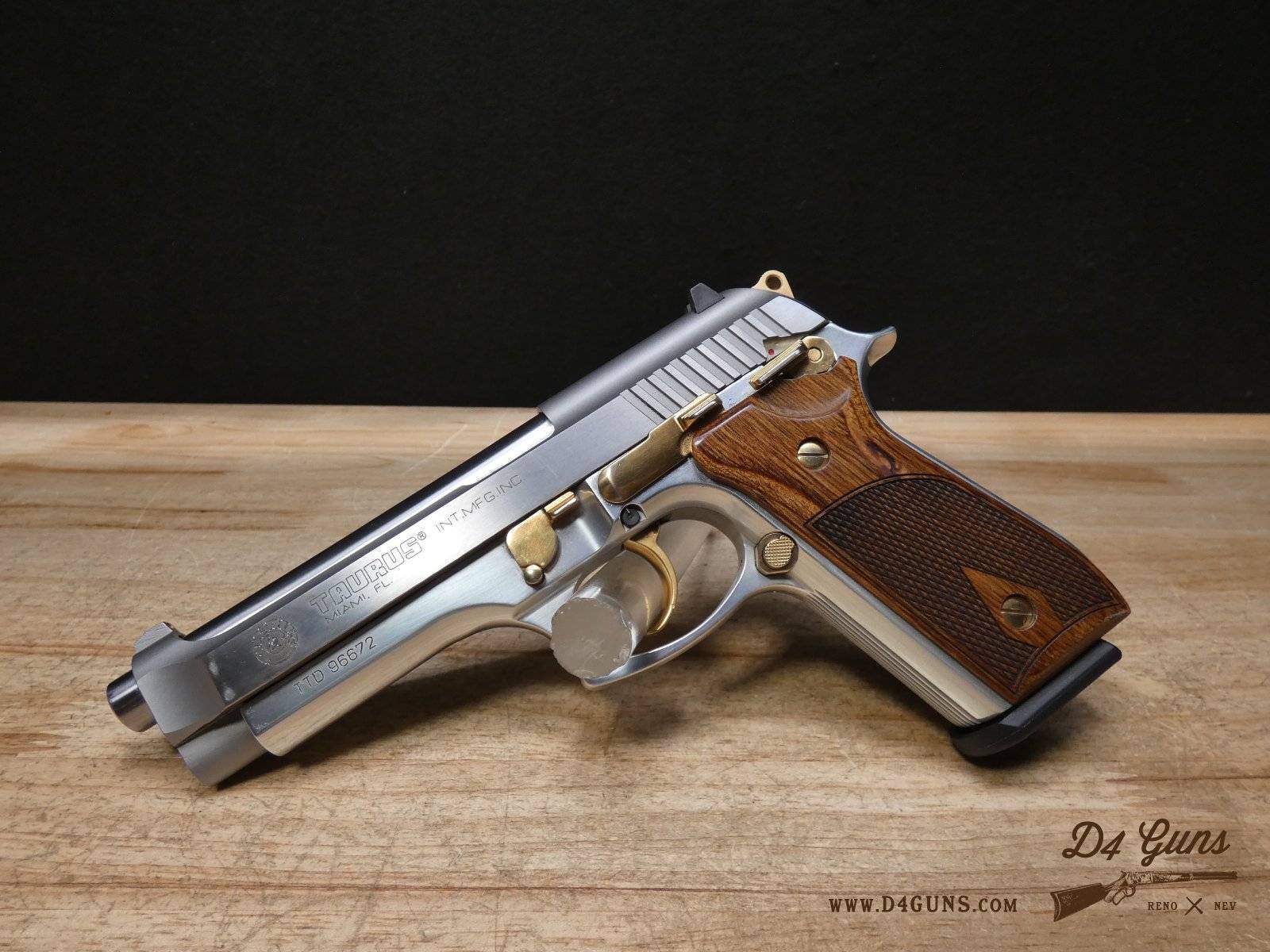 For sale is a Taurus Model PT AFS semi-automatic pistol in 9mm. Serial number- TTD96672. This pistol comes with wooden grips and two 10-round magazines. The Taurus PT92 is a double-action/single-action, 9mm, double-stack-magazine fed, short recoil-operated, semi-automatic pistol manufactured by Taurus in the former Beretta factory in São Paulo, Brazil. This pistol looks to have a stainless finish with golden trim/furnisher. Includes a leather holster as well! V2-J2 Barrel Length: 5 Bore condition: Good