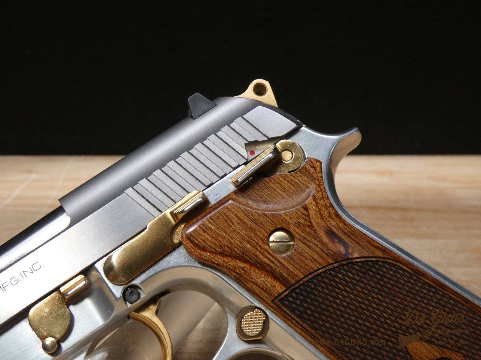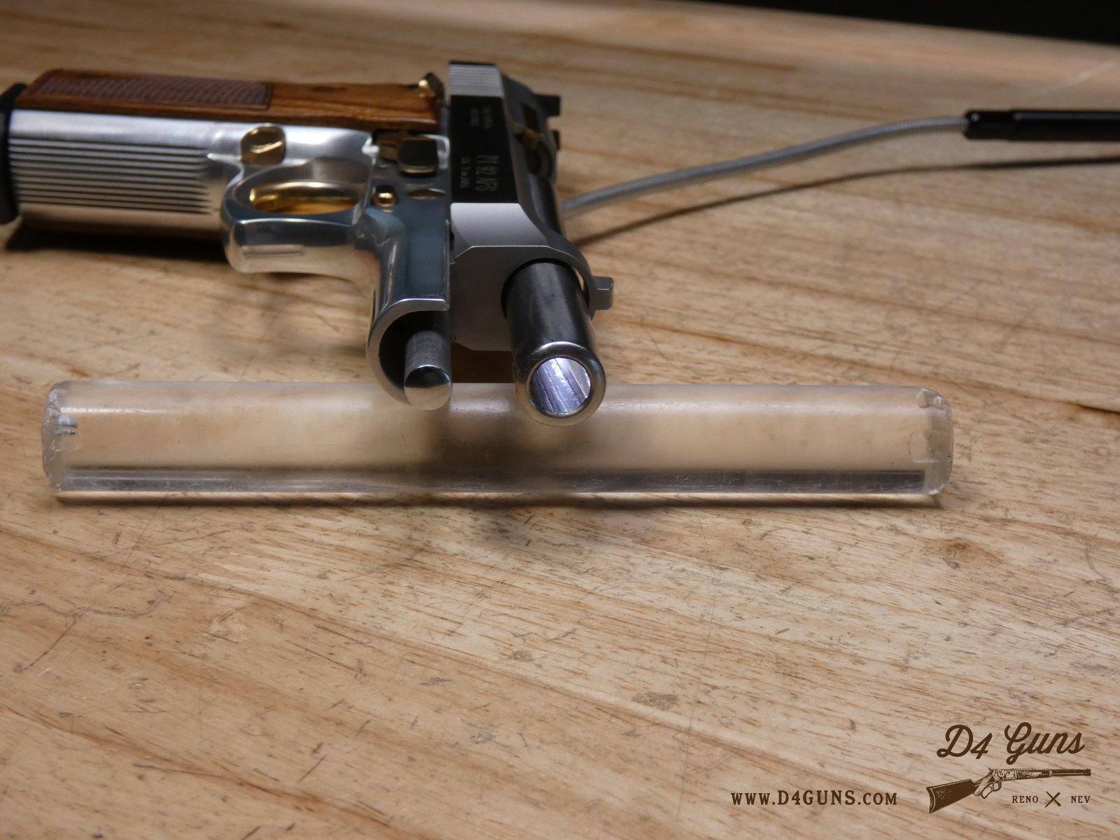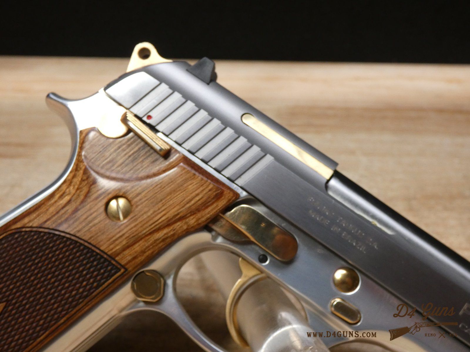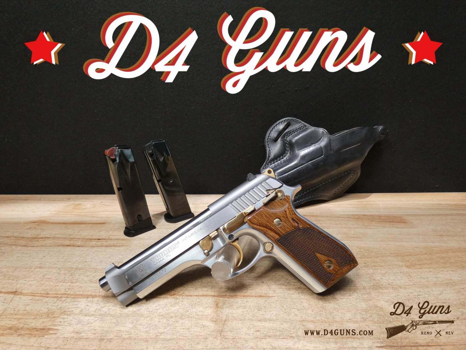 For sale is a Taurus Model PT AFS semi-automatic pistol in 9mm. Serial number- TTD96672. This pistol comes with wooden grips and two 10-round magazines. The Taurus PT92 is a double-action/single-action, 9mm, double-stack-magazine fed, short recoil-operated, semi-automatic pistol manufactured by Taurus in the former Beretta factory in São Paulo, Brazil. This pistol looks to have a stainless finish with golden trim/furnisher. Includes a leather holster as well! V2-J2 Barrel Length: 5 Bore condition: Good