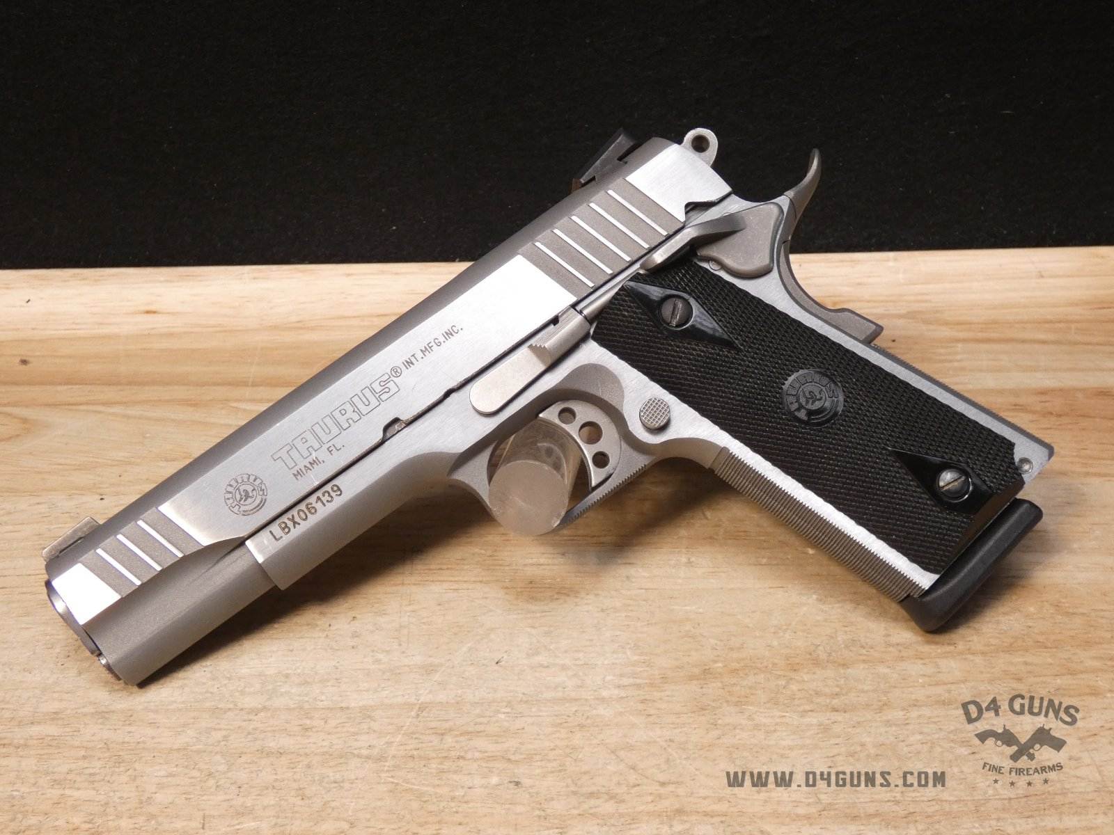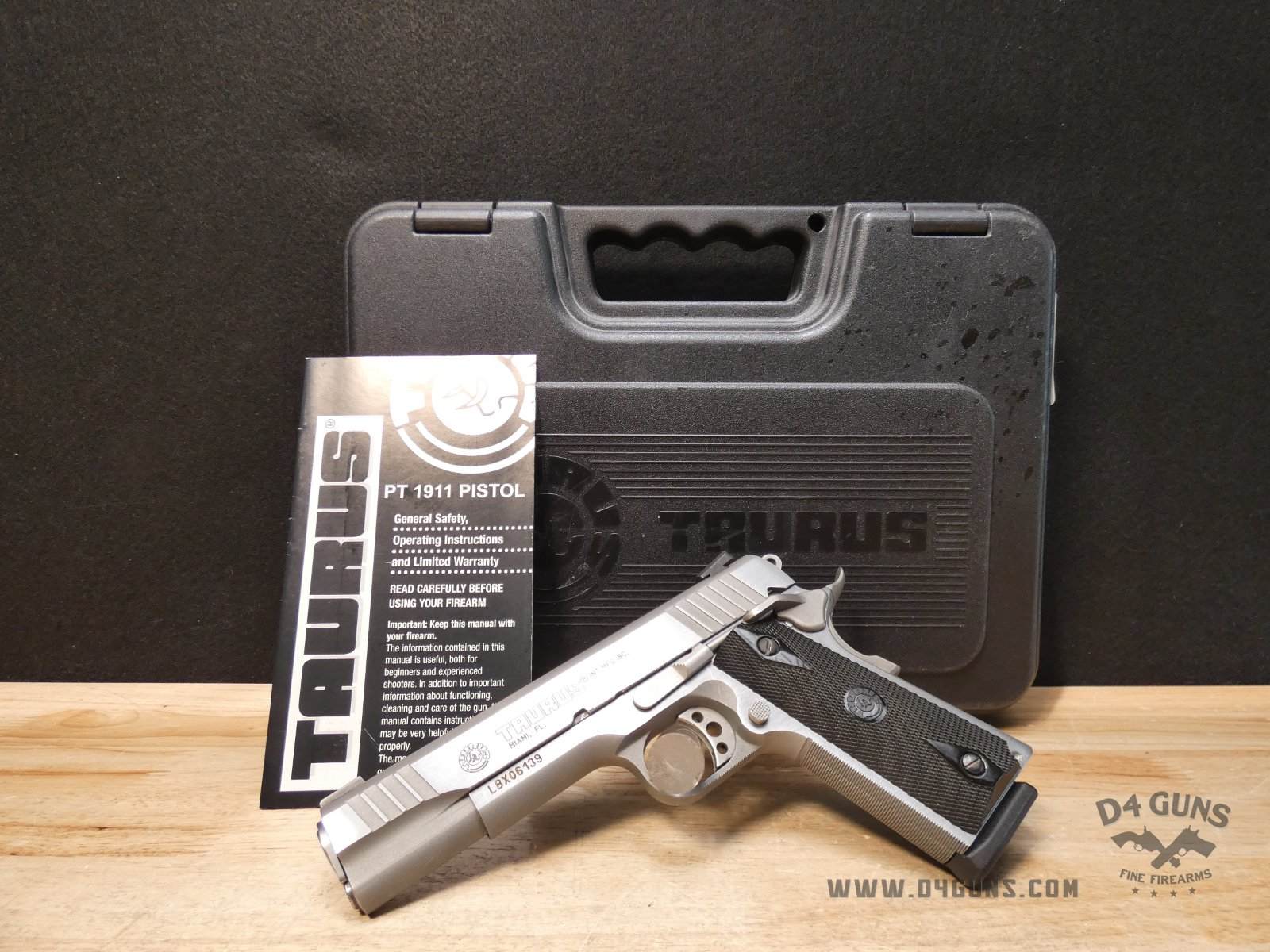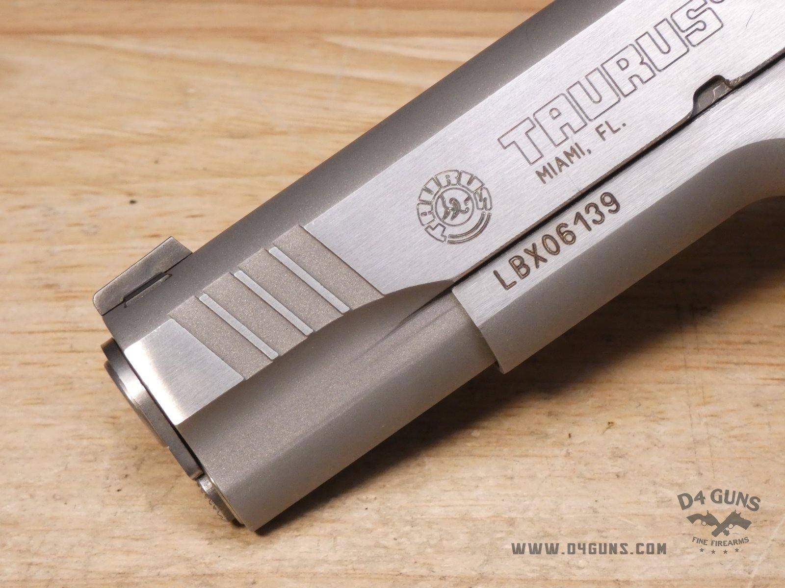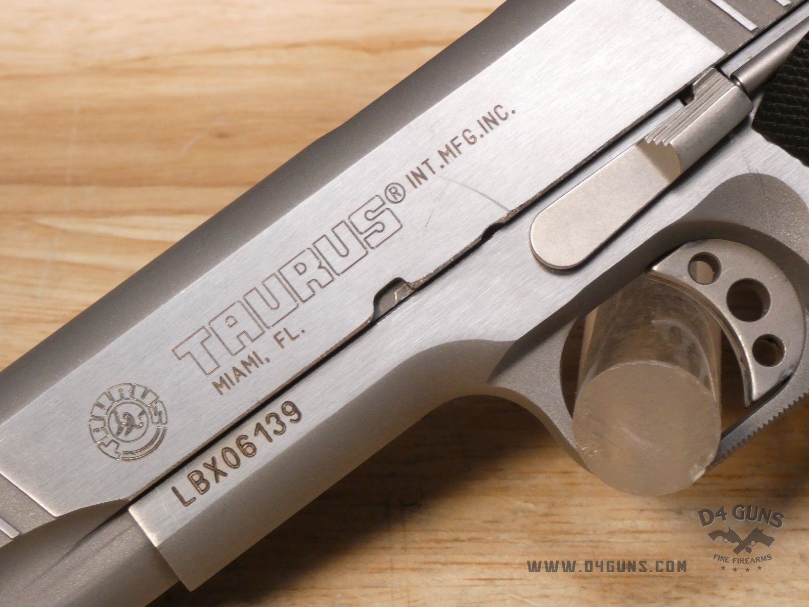 Up for grabs is a Taurus PT1911 semi-automatic pistol in .38 Super. Serial number-LBX06139. This pistol is in great condition and comes with the original case, manual, and (1) 9-Round magazine. Features a skeletonized trigger, ambidextrous safety and black checkered black grips. V2-H3 Barrel Length: 5 Bore condition: Good