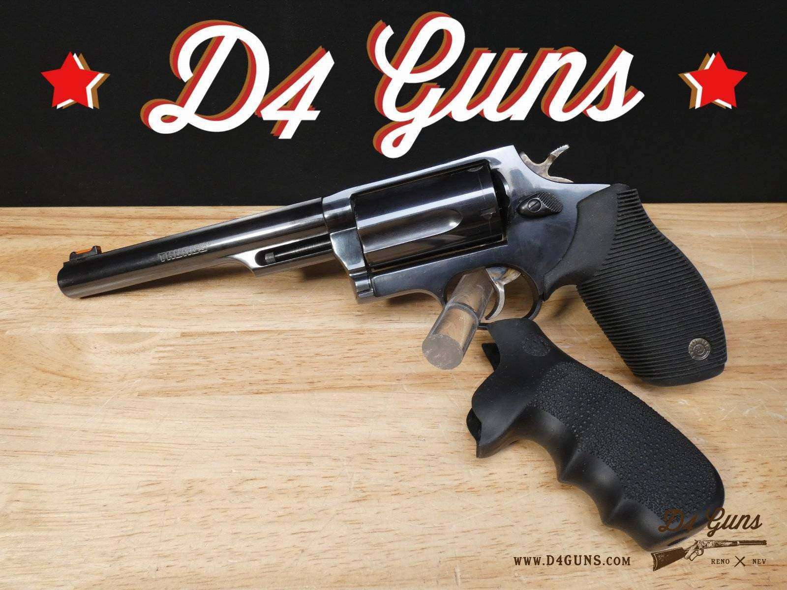For sale is a Taurus Judge revolver in .45LC/.410ga. Serial number- FX685789. More than a decade since it was first introduced, the legendary Taurus Judge still rules. Capable of chambering both 45 Colt and 410 shotgun shells, it's the original five-shot game changer. This particular revolver has a 6.5 inch barrel and also includes an extra grip. Please note that there is residual lead in the barrel that was unable to come out with cleaning. V2-C2 Barrel Length: 6.5 Bore condition: Good