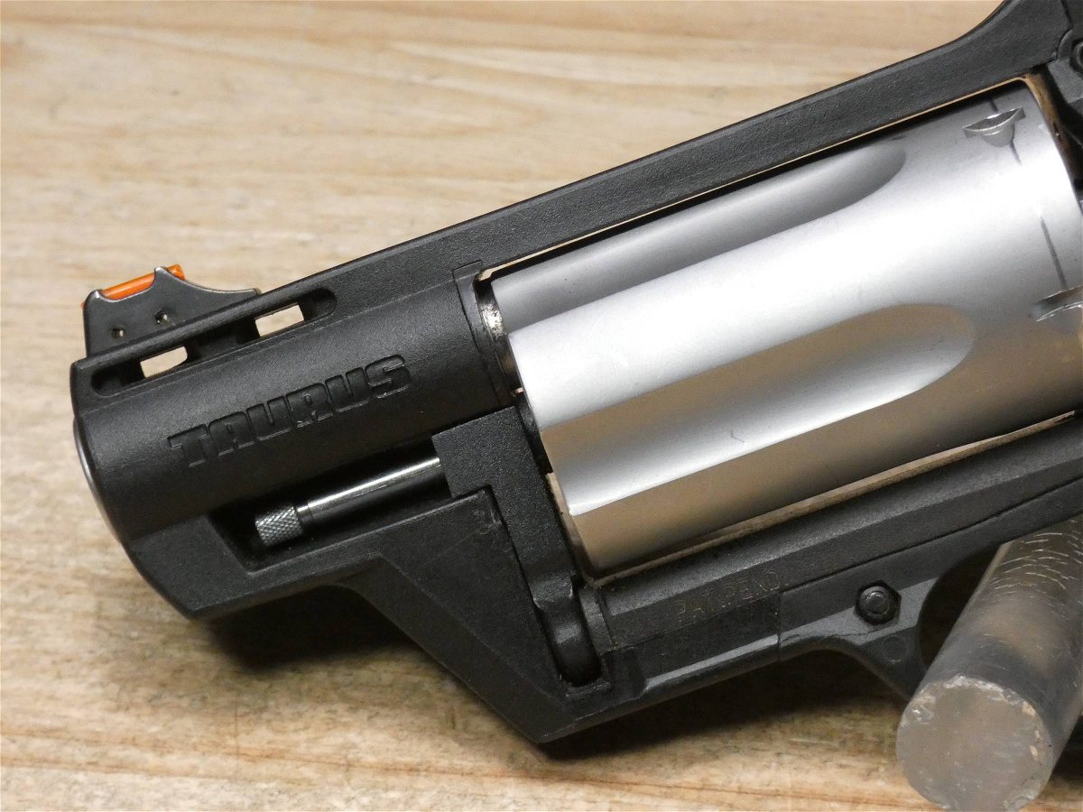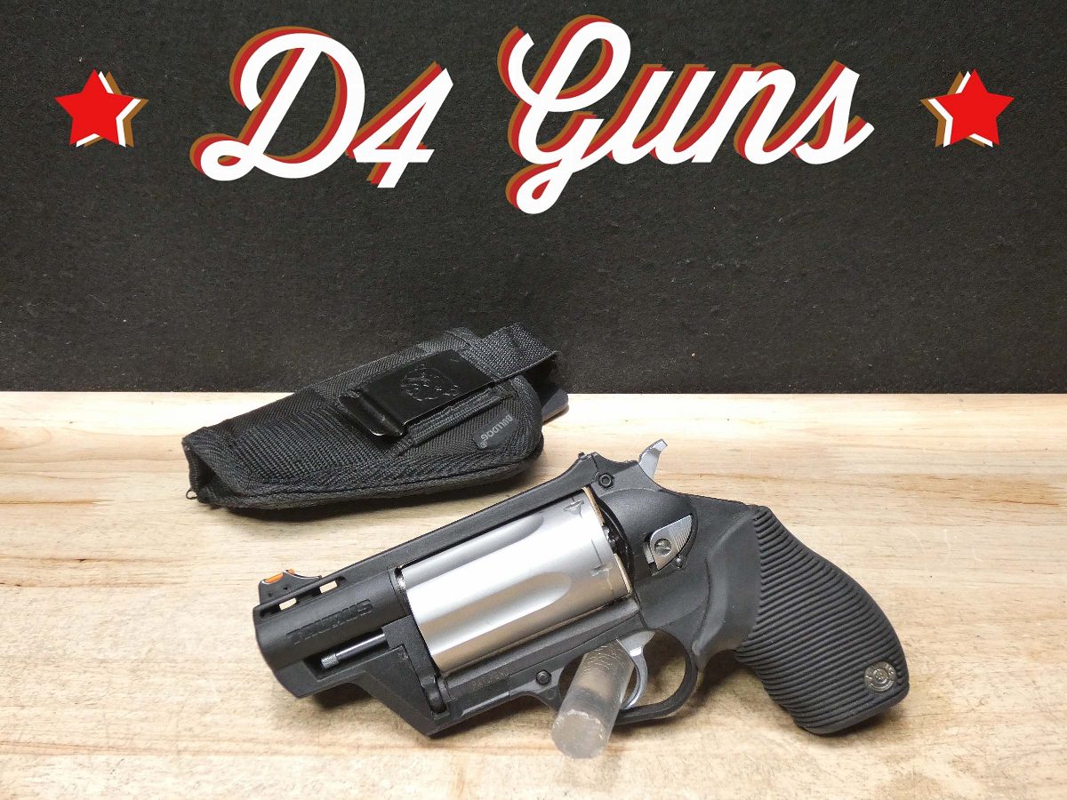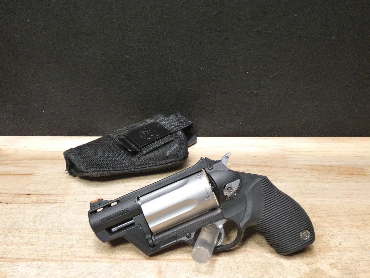 For sale is a Taurus The Judge Public Defender Poly double-action revolver in .45LC/.410ga. Serial number- EU471960. It is in great conditioning and includes a holster. More than a decade since it was first introduced, the legendary Taurus Judge still rules. Capable of chambering both 45 Colt and 410 shotshells, it's the original five-shot game changer. V2-D1 Barrel Length: 2 Bore condition: Excellent