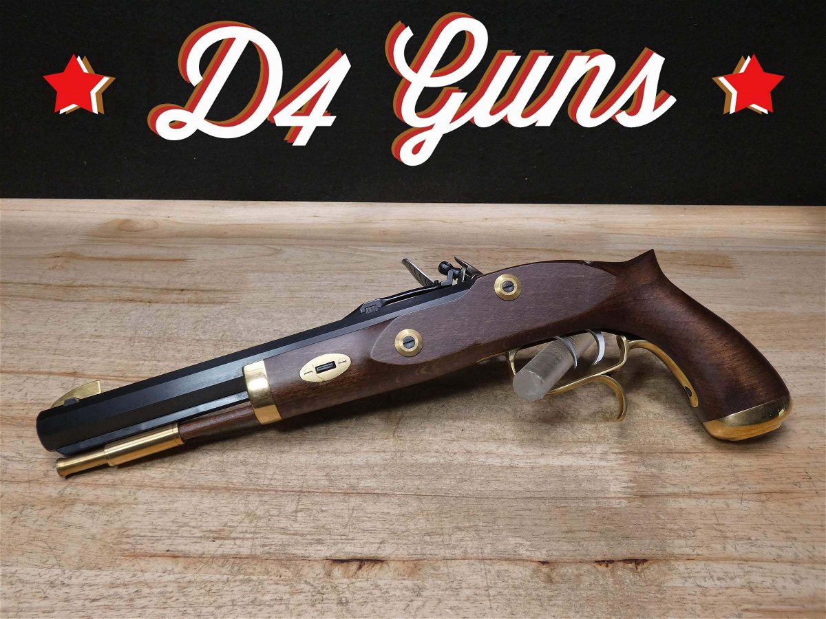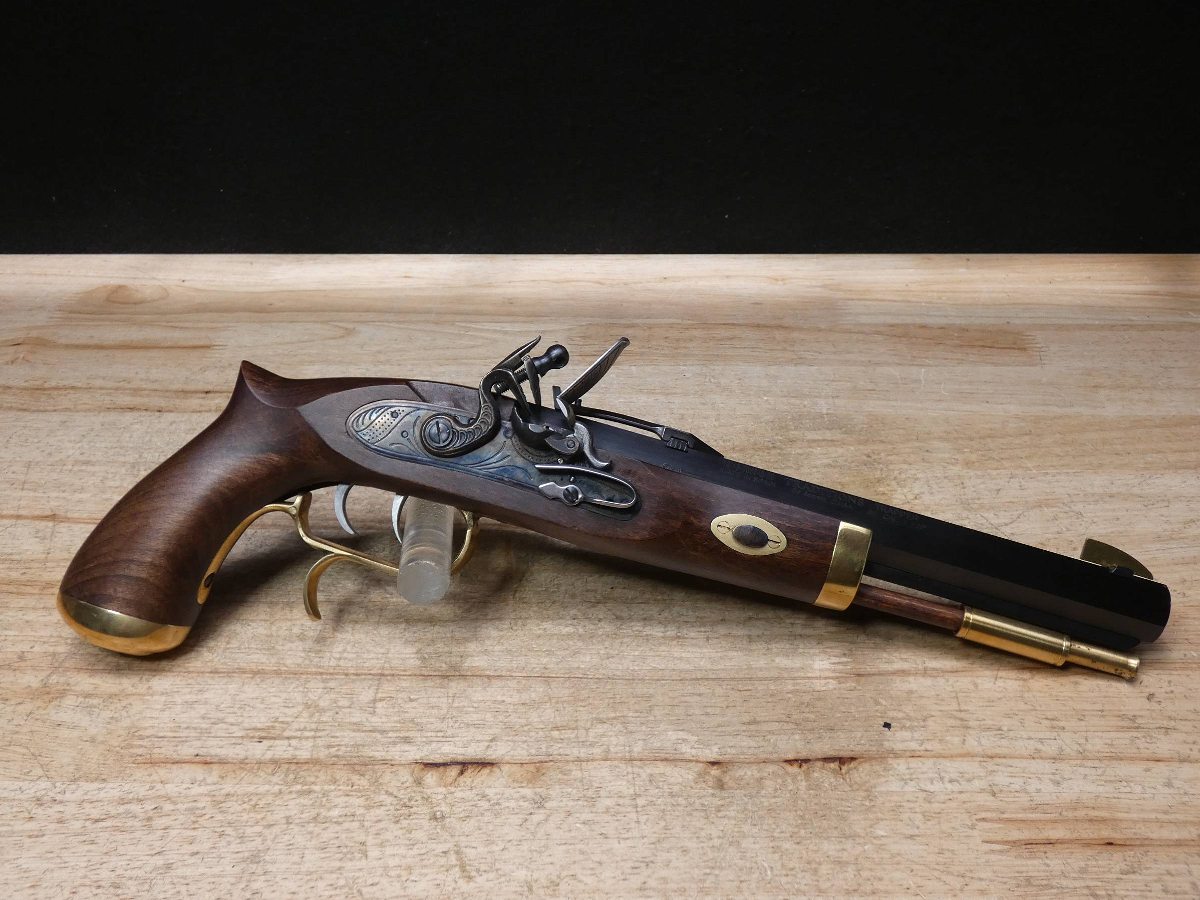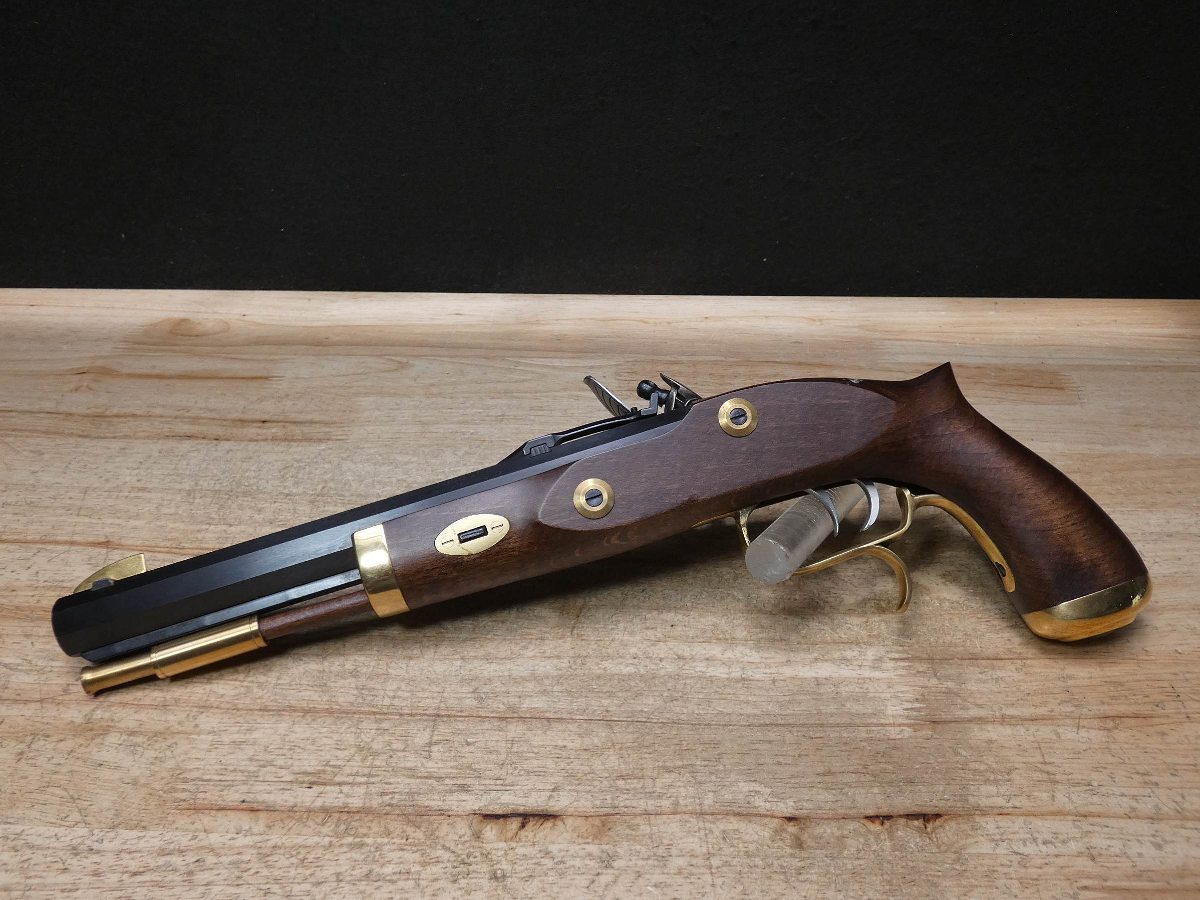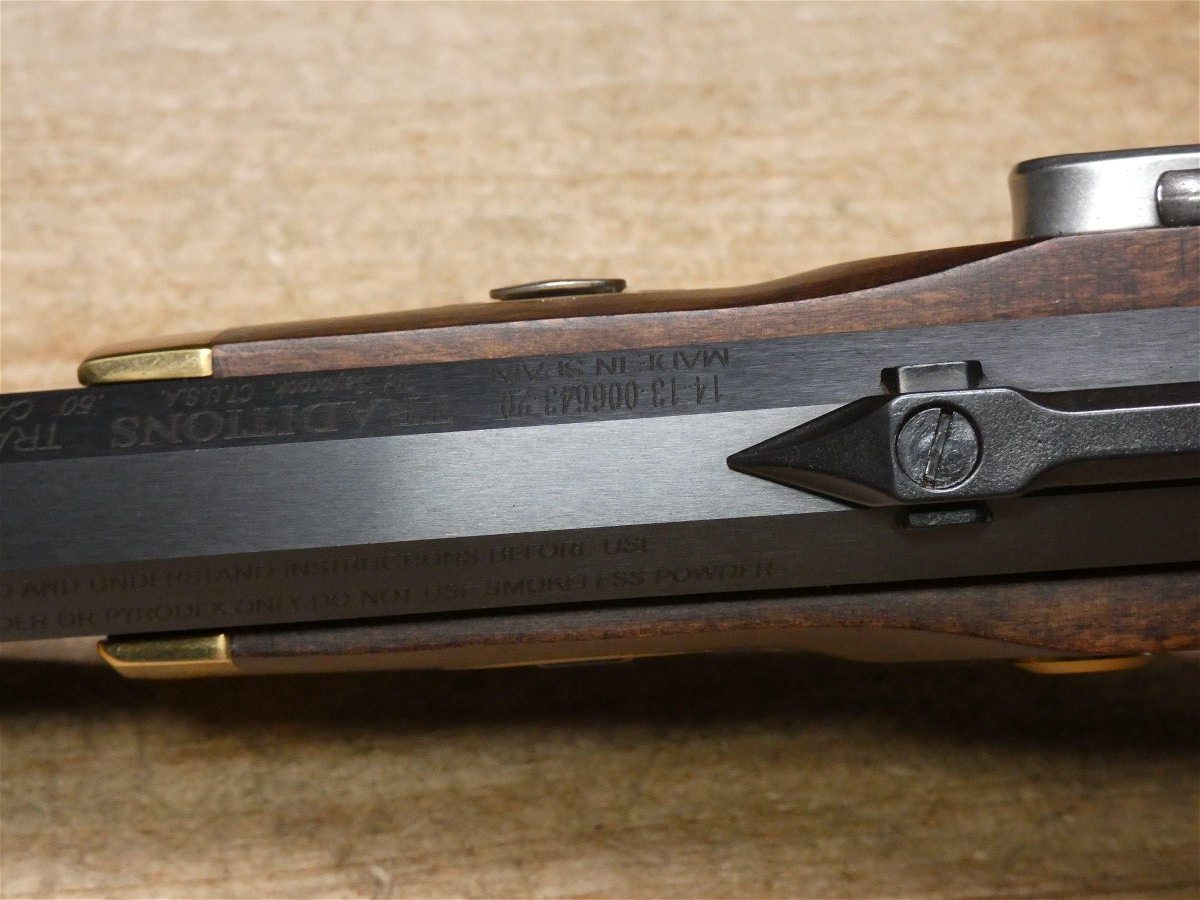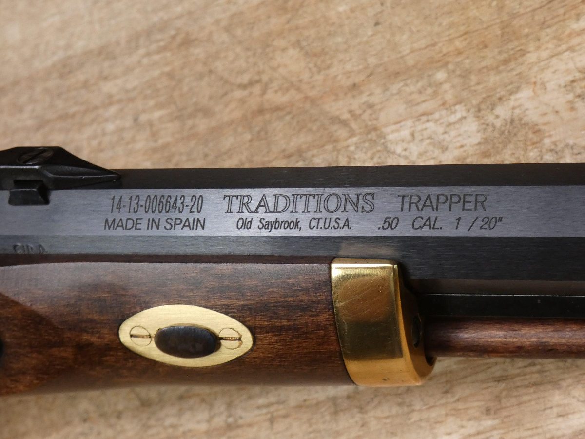 For sale is a Traditions Trapper Black Powder Pistol in .50 Cal. Serial number- 14-13-006643-20. The Traditions Trapper pistol’s primitive-style adjustable rear sight, octagonal barrel, and double-set triggers capable of firing set or unset, allows the shooter to predictably put his shots on target. This Traditions pistol is a .50 caliber percussion model.  V1-G2 Barrel Length: 9 Bore condition: Good