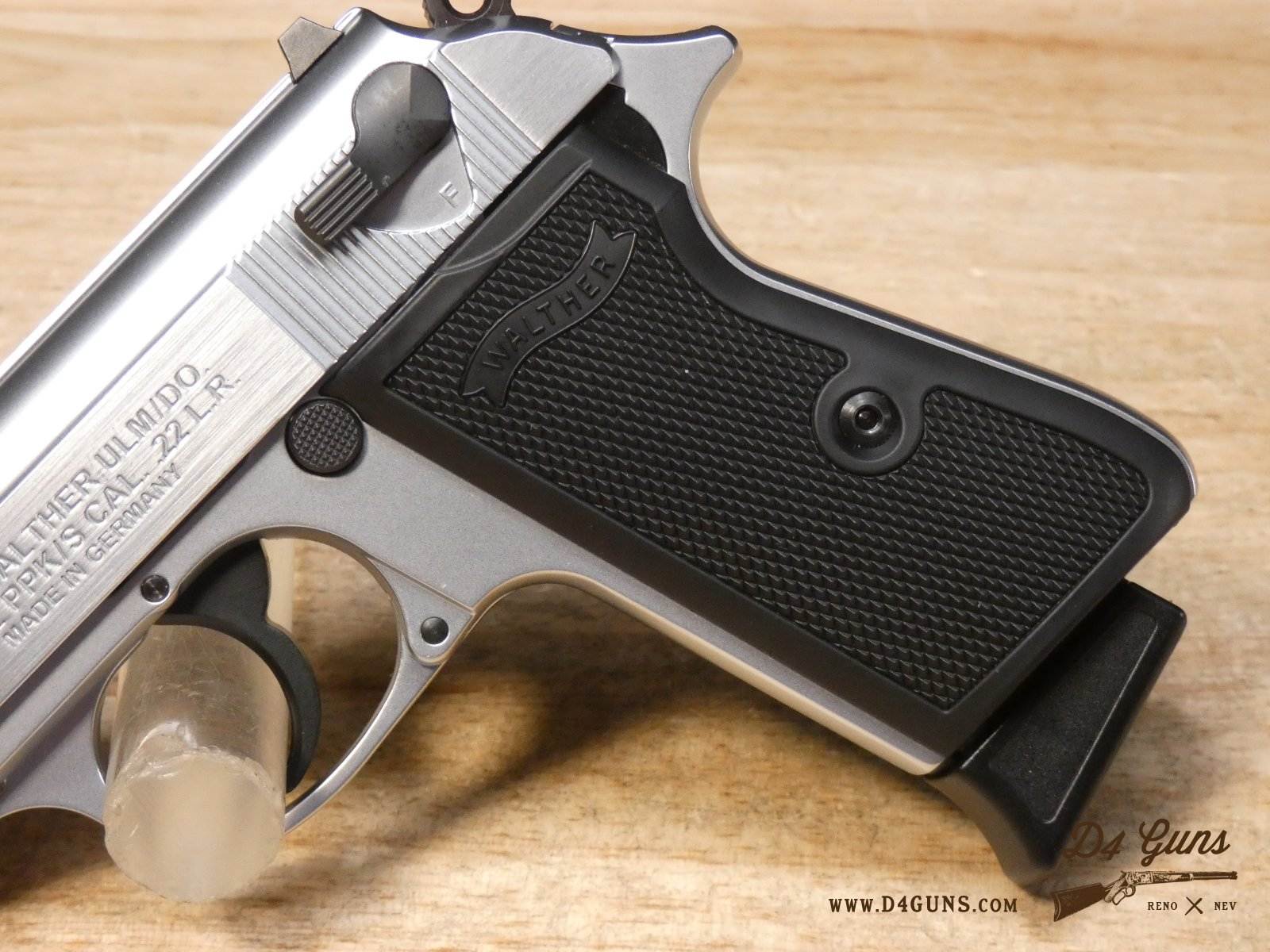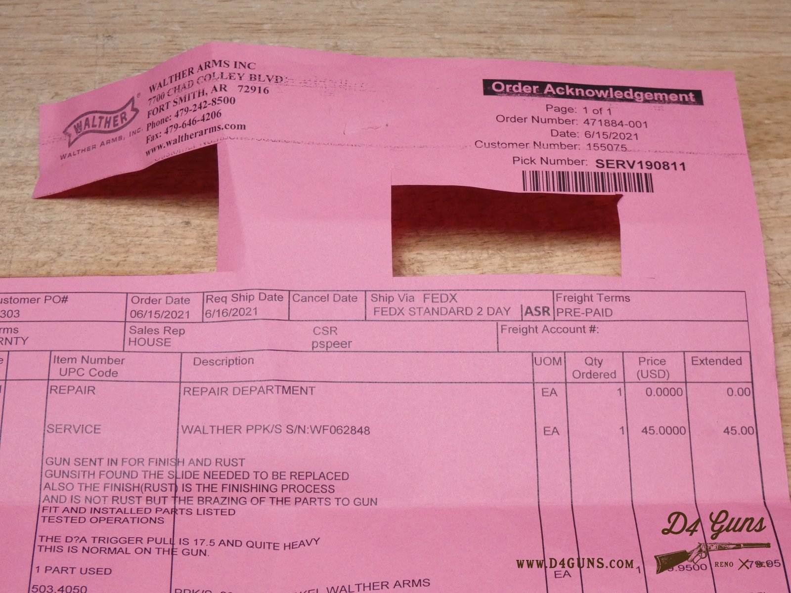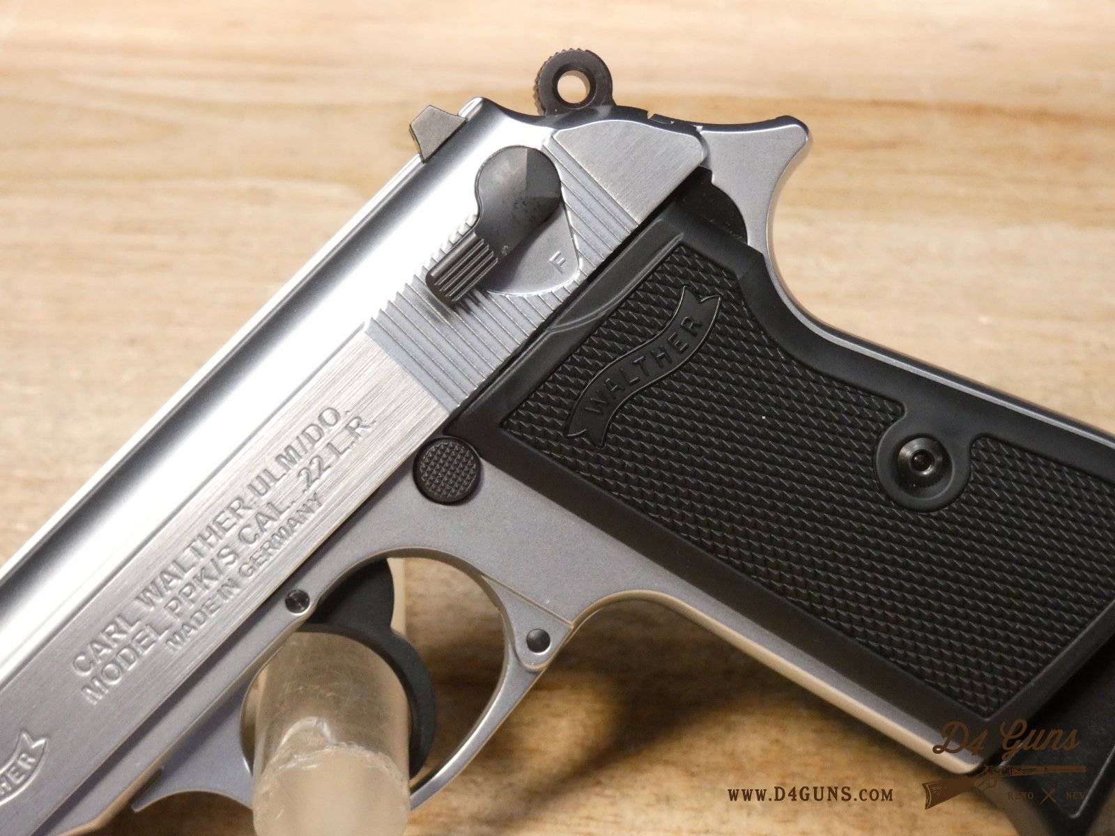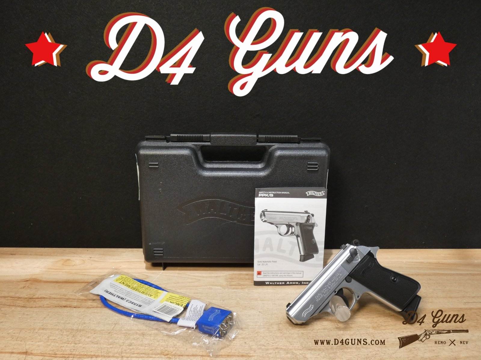 For sale is a Walther PPK/S semi-automatic pistol in .22 LR. Serial number-WF062848. This pistol is in great condition and comes with the original case, manual, cable lock, and 1 magazine. The date code of "CB" leads us to believe the pistol was manufactured in 2021. A 1-to-1 scale of the Walther PPK/S in .380, this PPK/S .22 LR affords you the look, style, and feel of the original in a rimfire caliber. Equipped with a single-action/double-action trigger, black checkered grips and functional safety/decocker, the PPK/S .22 is the perfect recreational firearm for any situation. This rimfire pistol also comes with a threaded barrel direct from the factory, making it suppressor-ready out of the box. This particular firearm appears to have had warranty work performed by Walther. See photo of invoice for details. V2-J1 Barrel Length: 3.25 Bore condition: Excellent Year Manufactured: 2021