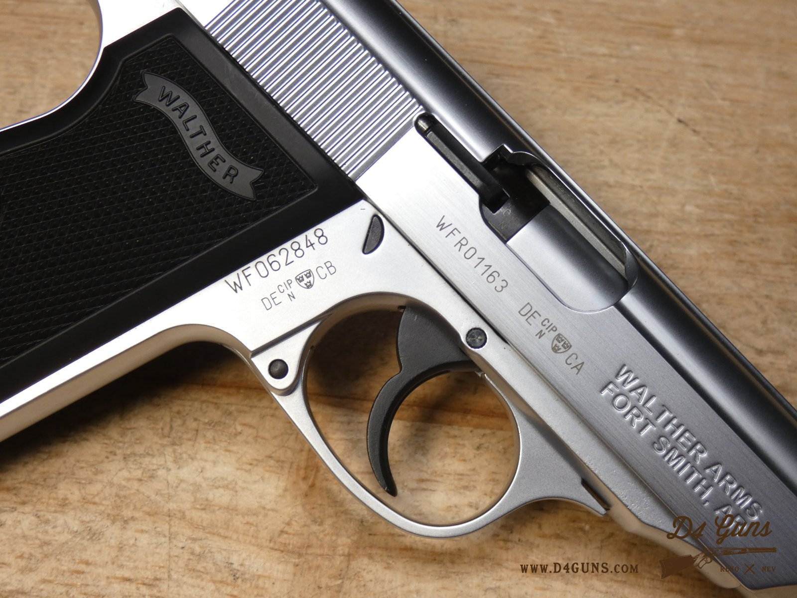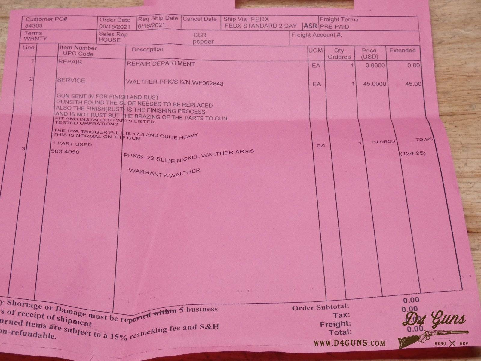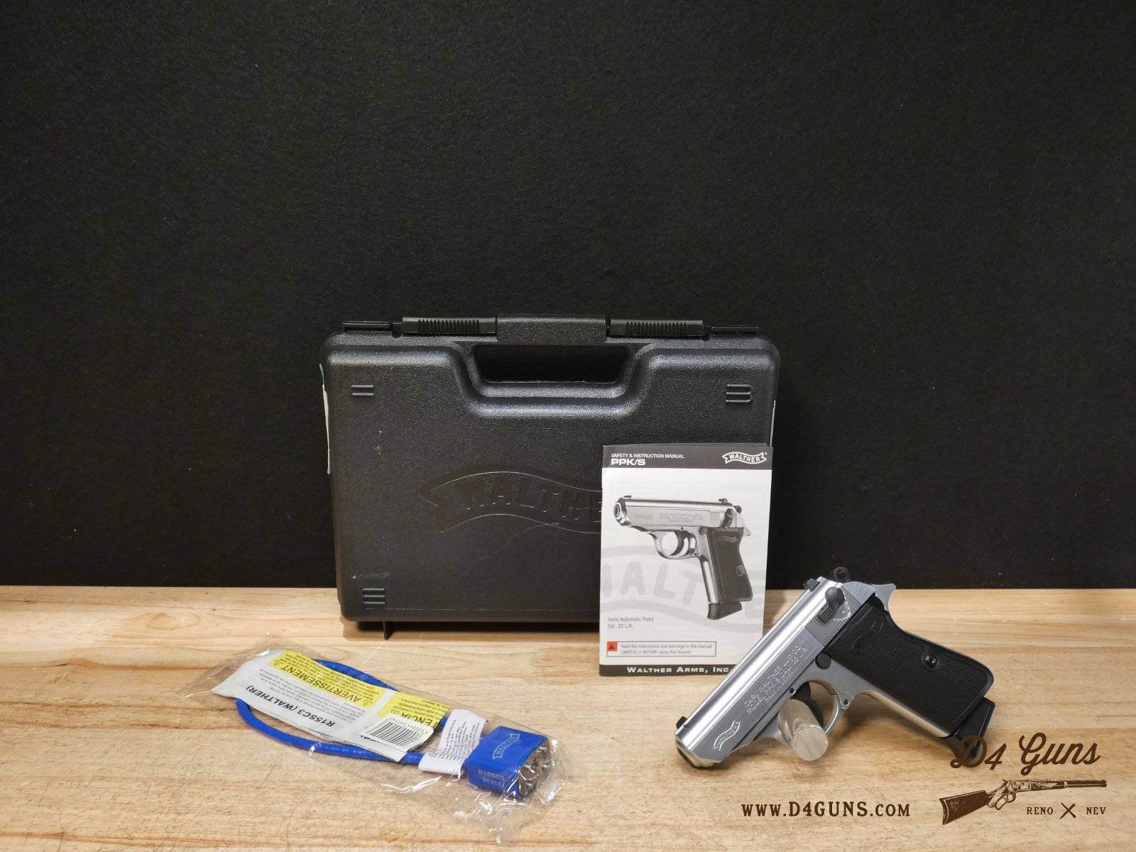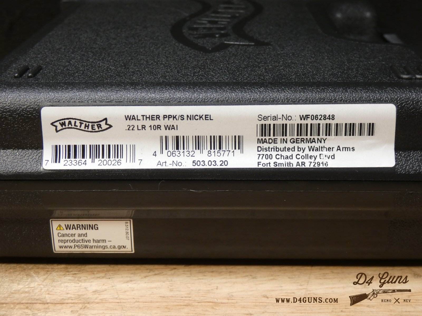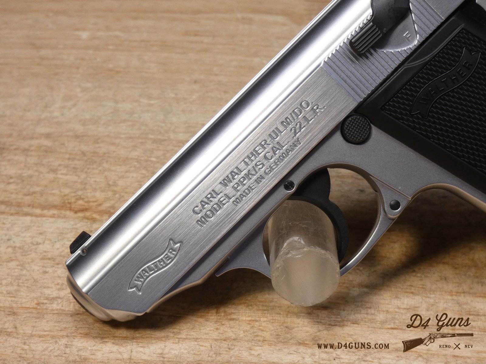 For sale is a Walther PPK/S semi-automatic pistol in .22 LR. Serial number-WF062848. This pistol is in great condition and comes with the original case, manual, cable lock, and 1 magazine. The date code of "CB" leads us to believe the pistol was manufactured in 2021. A 1-to-1 scale of the Walther PPK/S in .380, this PPK/S .22 LR affords you the look, style, and feel of the original in a rimfire caliber. Equipped with a single-action/double-action trigger, black checkered grips and functional safety/decocker, the PPK/S .22 is the perfect recreational firearm for any situation. This rimfire pistol also comes with a threaded barrel direct from the factory, making it suppressor-ready out of the box. This particular firearm appears to have had warranty work performed by Walther. See photo of invoice for details. V2-J1 Barrel Length: 3.25 Bore condition: Excellent Year Manufactured: 2021