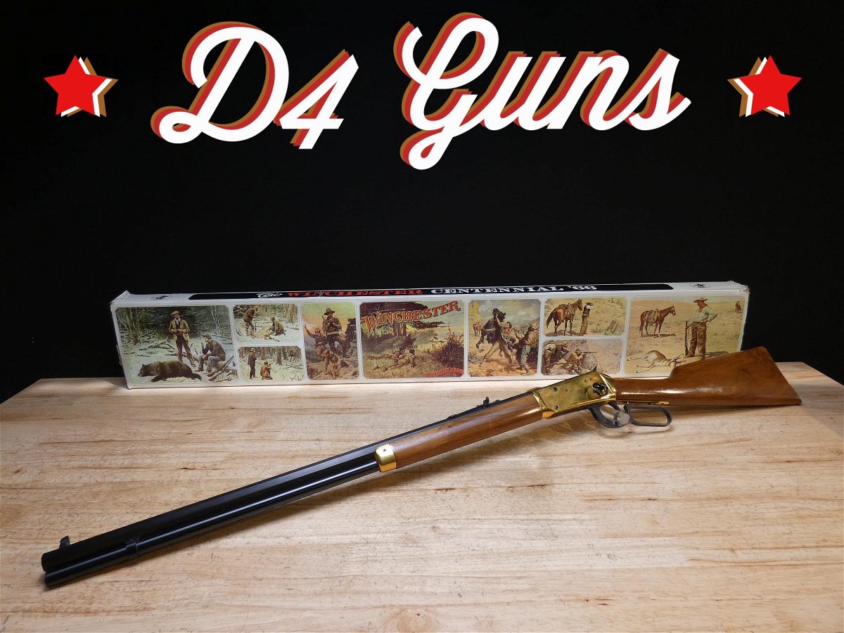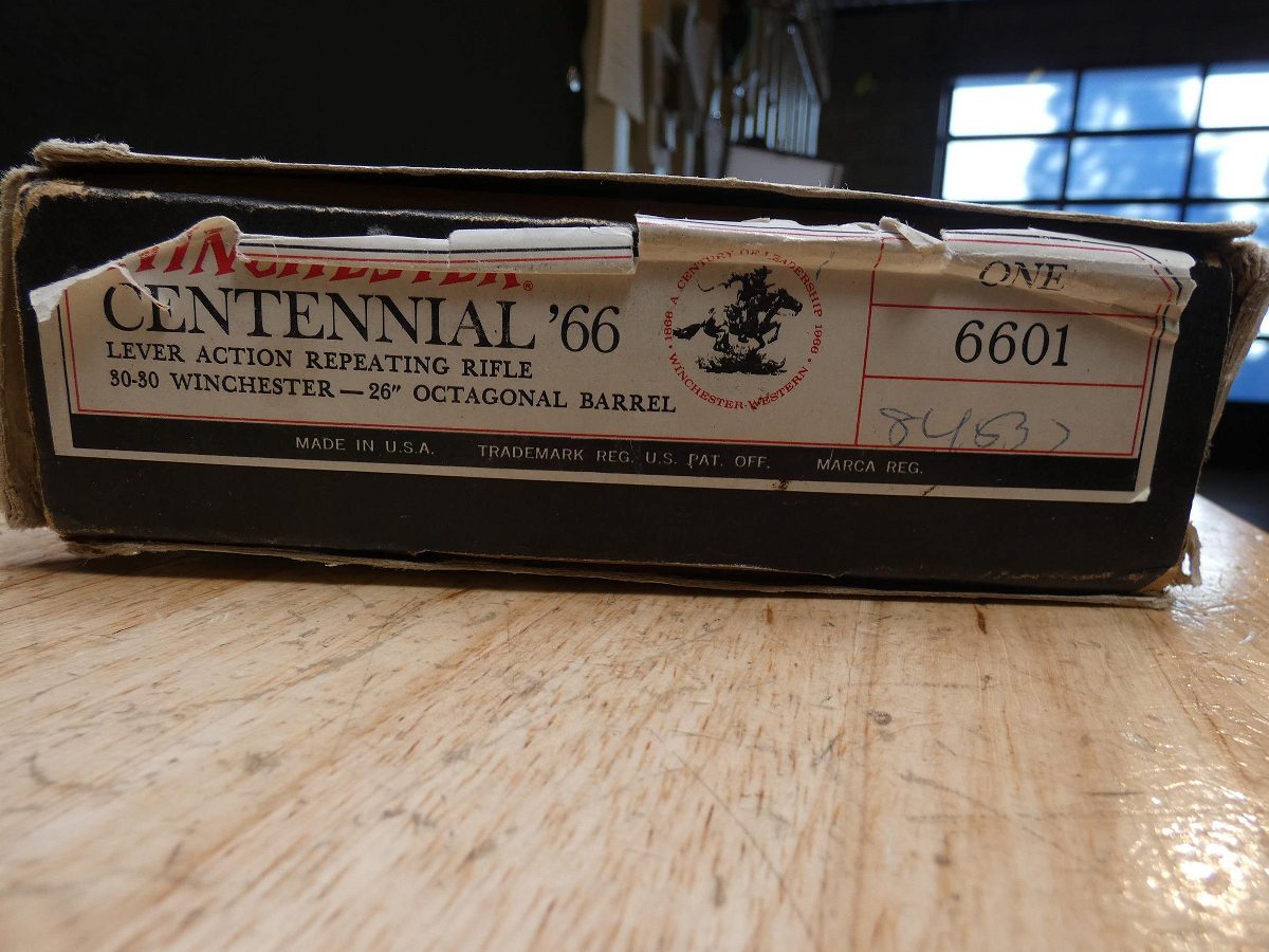 For sale is a Winchester Model 1894 Centennial '66 lever action rifle in .30-30 Winchester. Serial number- 84537. This Model 94 is in good condition and comes with the original box and box sleeve. Features a 26" octagonal barrel with an excellent barrel. In 1966 was the Winchester Repeating Arms Company's 100th year of operation. To commemorate this occasion, Winchester produced a run of collector Model 94 rifles, the Winchester Centennial '66. These were based on post-1964 Model 94's actions with a brass receiver and forend cap, brass "rifle" (curved) buttplate, saddle ring, and a heavy octagon barrel with a full-length tubular magazine that is nicely polished and deeply blued. V1-K1 Barrel Length: 26 Bore condition: Excellent Year Manufactured: 1966