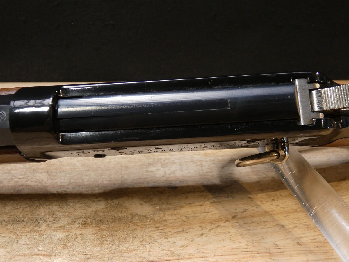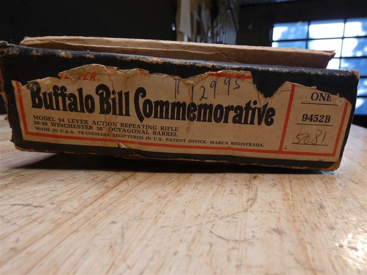 For sale is a Winchester Model 94 Buffalo Bill Commemorative lever action rifle in .30-30 Winchester. Serial number- WC5081. This Model 94 is in good condition and comes with the original box. There were just over 112,000 total made of this commemorative rifle. This commemorative model features an engraved receiver, an octagonal barrel, silver writing on the barrel and tang, a silver-finished saddle ring, trigger, hammer, locking block, forend cap, buttplate, and loading gate, and a deluxe Walnut stock with a Buffalo Bill medallion inlaid in the right side of the buttstock. We have no doubt that this Buffalo Bill Commemorative Model 94 saddle ring carbine would be an excellent shooter and fun range/farm gun for someone who enjoys the classics. V1-K1 Barrel Length: 26 Bore condition: Excellent